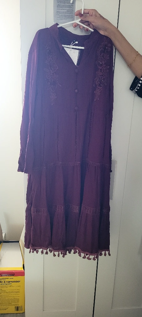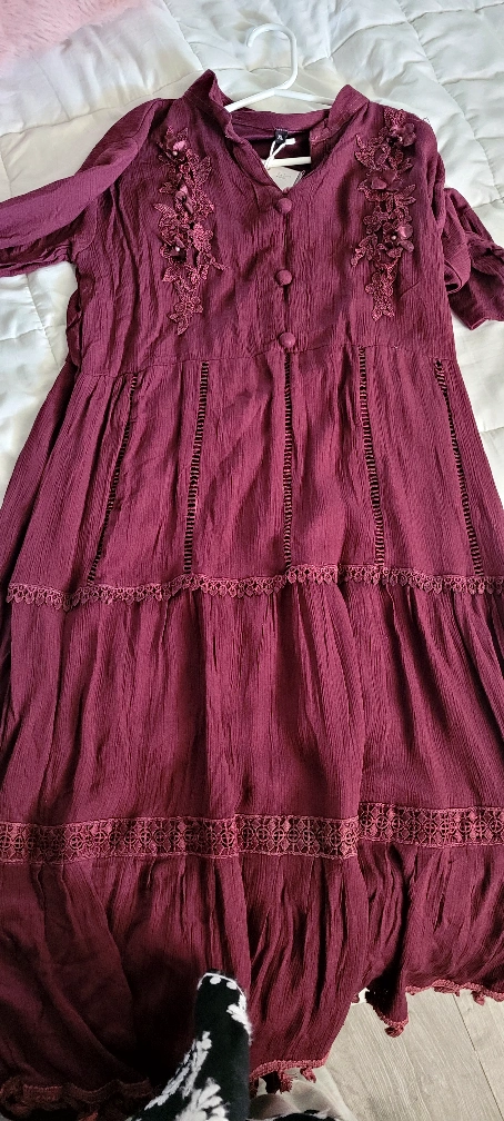Beautiful burgundy maxi dress. Features embroidered floral accents and layered lace trim. Long sleeves and button-up front. Relaxed fit. Size XL but fits small too.