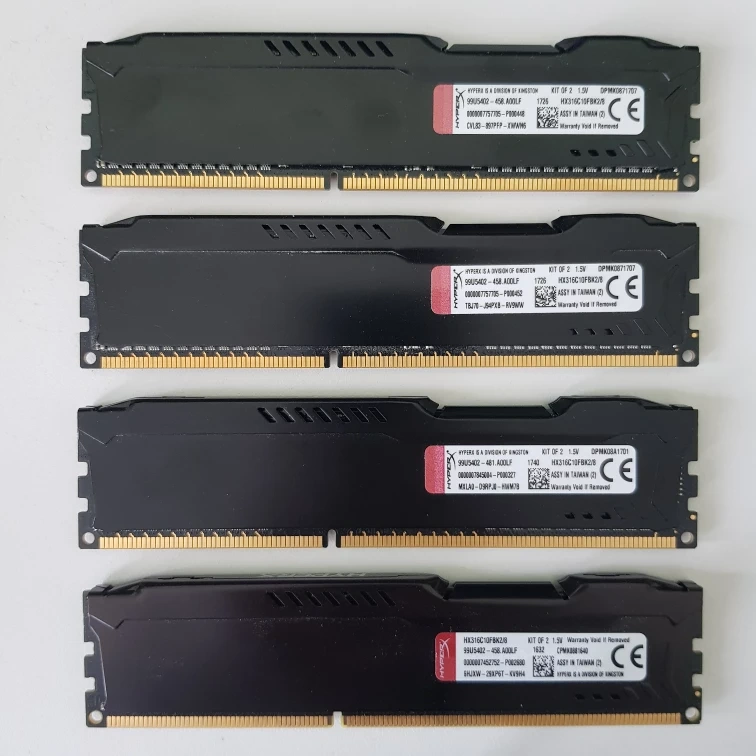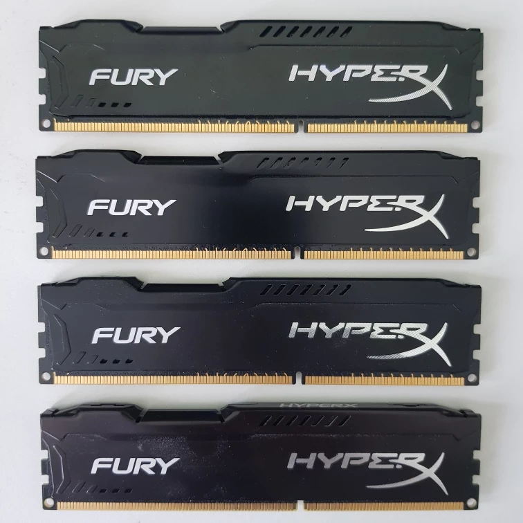 Four sticks of HyperX Fury RAM. HyperX HX316C10FBK2/8 is a kit of two 512M x 64-bit (4GB)DDR3-1600 CL10 SDRAM (Synchronous DRAM) 1Rx8 memory modules, based on eight 512M x 8-bit DDR3 FBGA componentsper module. Total 2 piece kit capacity is 8GB. Total 4 piece kit is 16GB.