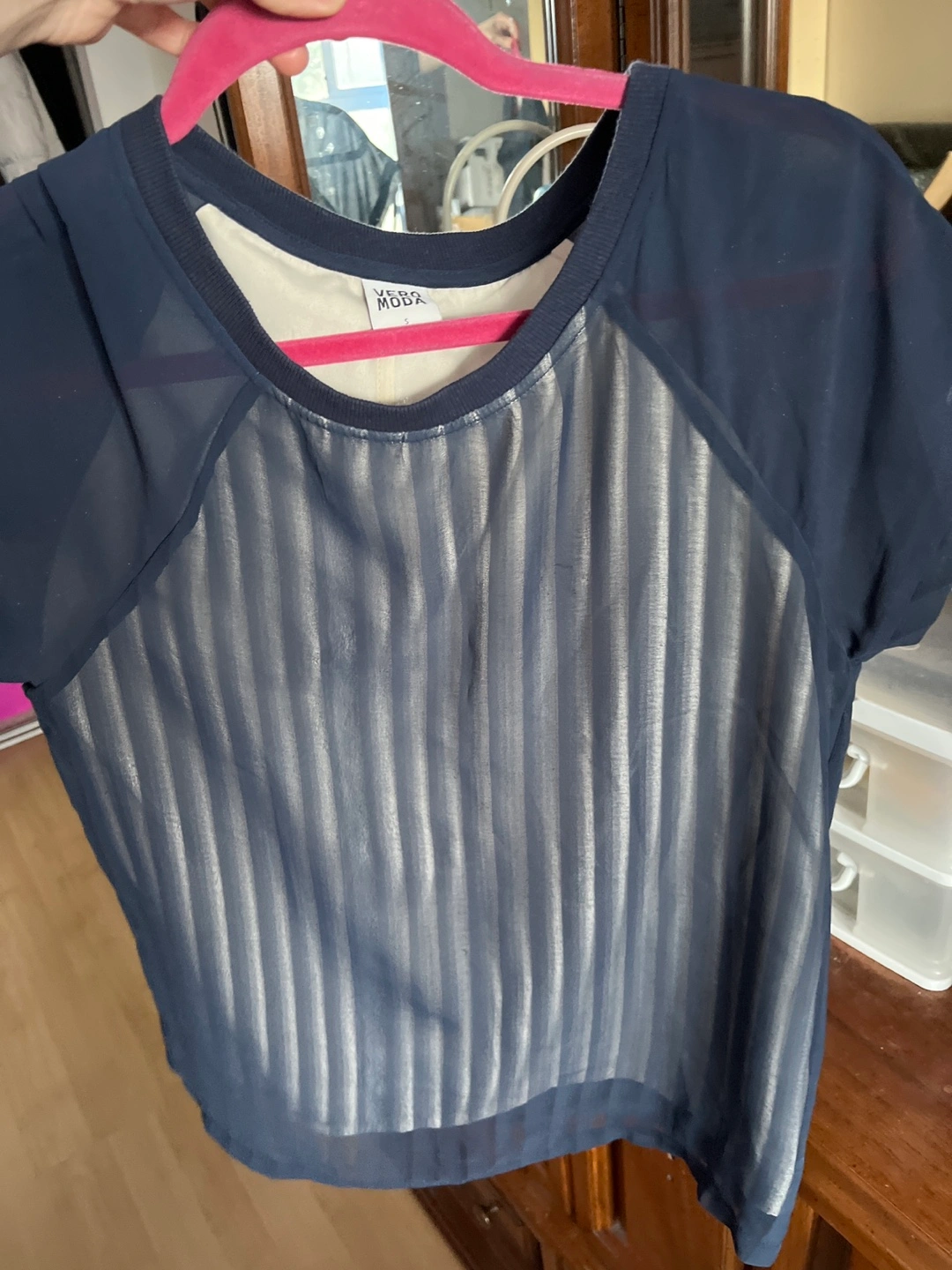 Navy blue sheer blouse. Features metallic silver stripes and short sleeves. Raglan sleeves with a crew neck.