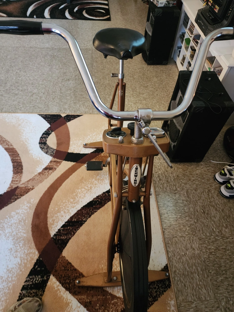 Vintage Schwinn Airdyne exercise bike. Gold-toned metal frame. Black seat. Working condition. Minor wear consistent with age and use.