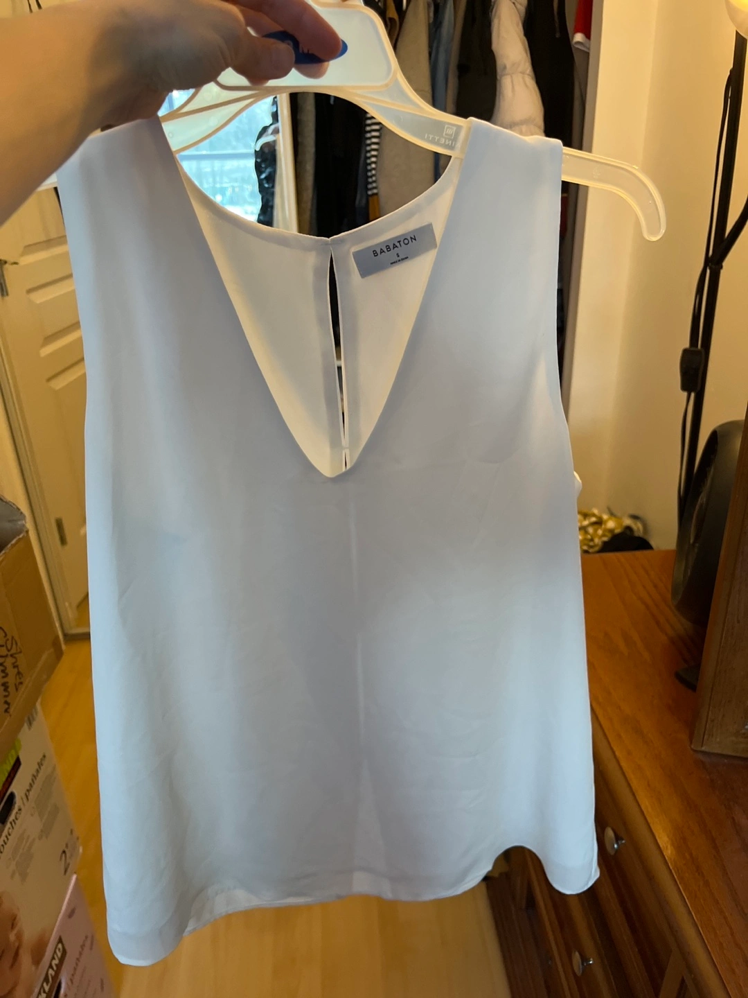 White sleeveless blouse. V-neckline with a keyhole detail at the back. Simple and elegant design. Suitable for various occasions.