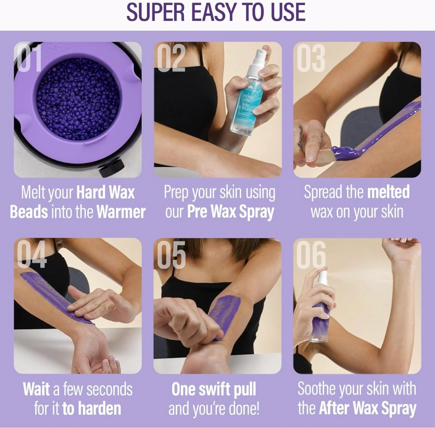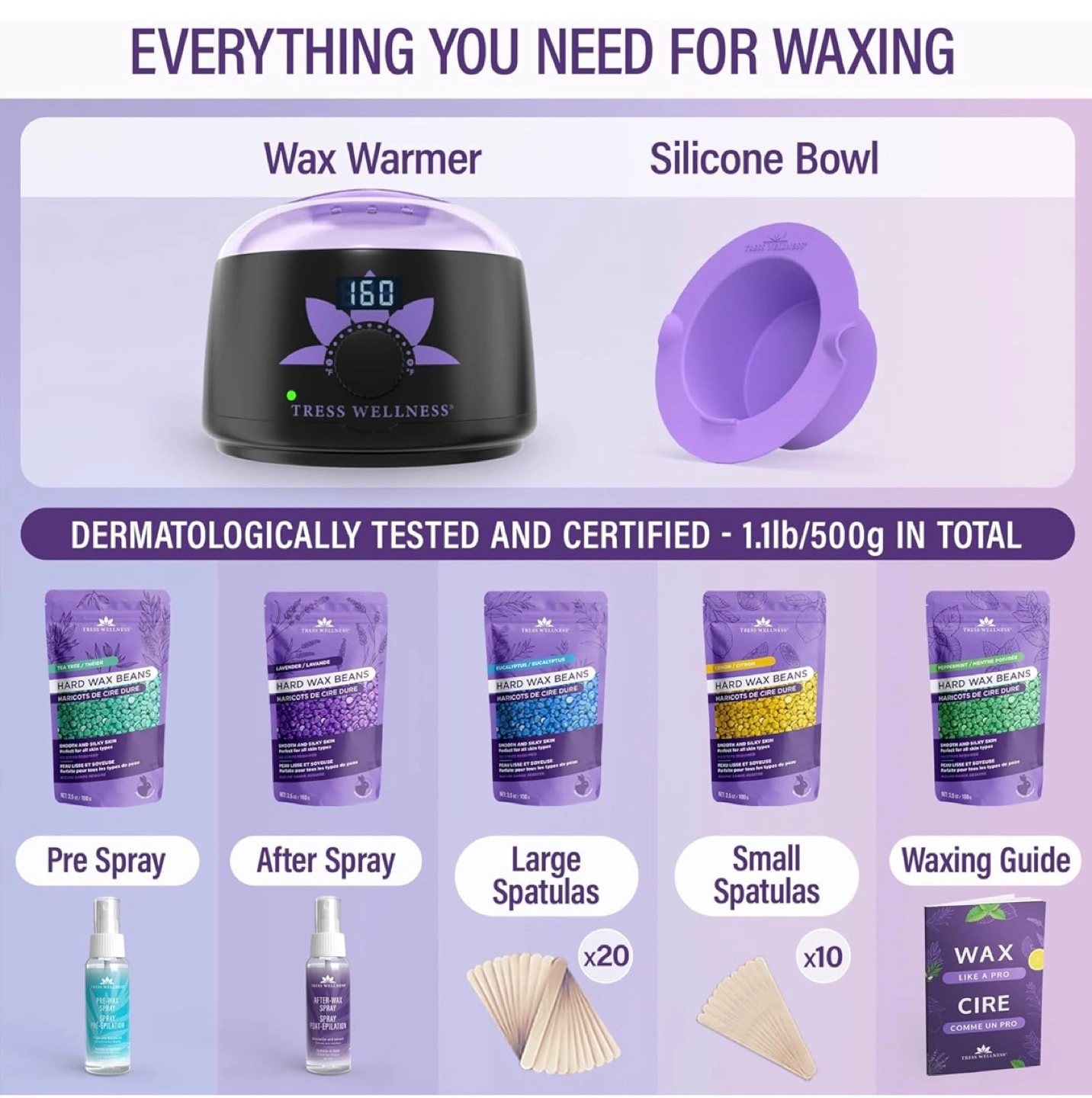 Wax warmer kit, includes silicone bowl, hard wax beans, pre and after wax spray, and spatulas. Easy to use, great for at-home waxing. Dermatologically tested. 4.3 star reviews by more than 29K users on Amazon.
