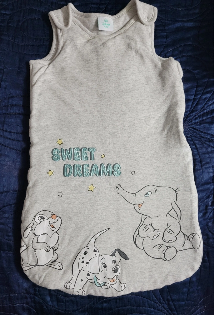 Grey sleeveless baby sleeping bag. Features a sweet dreams design with Bambi, Dumbo, and Pongo. Suitable for warmer weather.