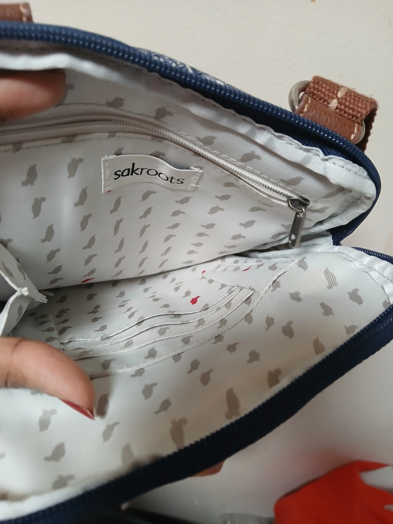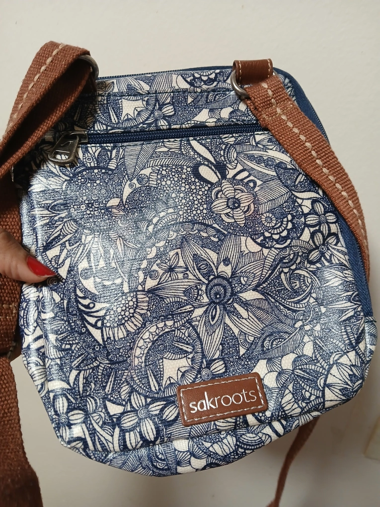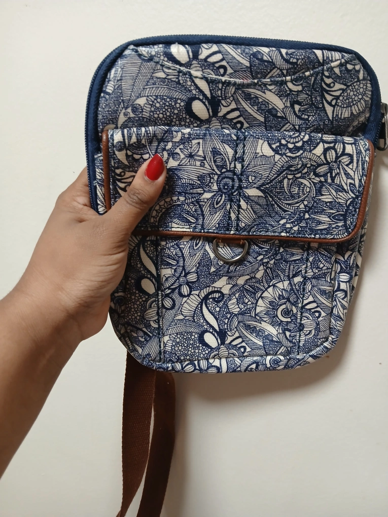 Small crossbody bag. Blue and white floral print. Brown straps. Multiple pockets. Zipper closure. price is firm. pick up midland and Danforth or 401 bay street or stc mall