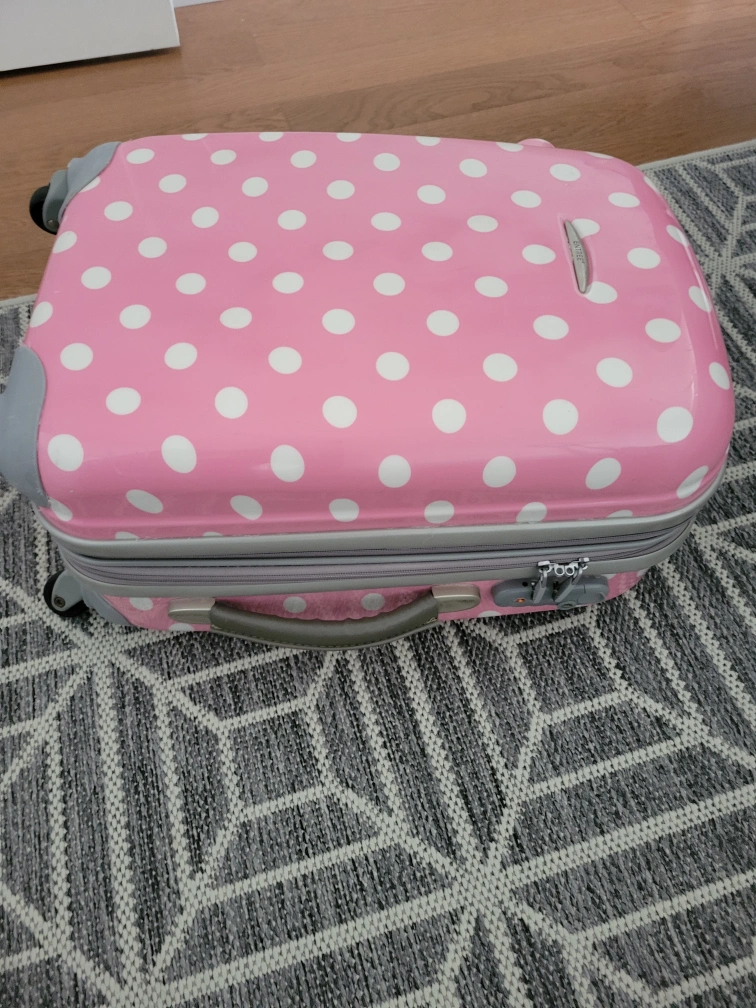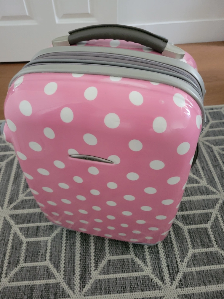 Cute pink carry-on suitcase. Polka dot design. Features spinner wheels and a retractable handle. Interior includes zippered compartments and tie-down straps. Great for weekend getaways or short trips.