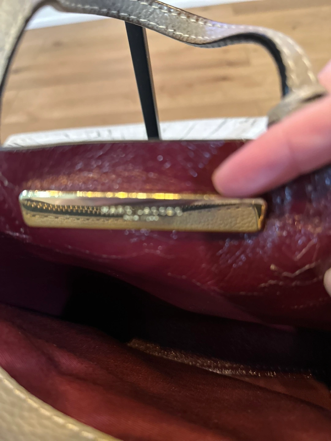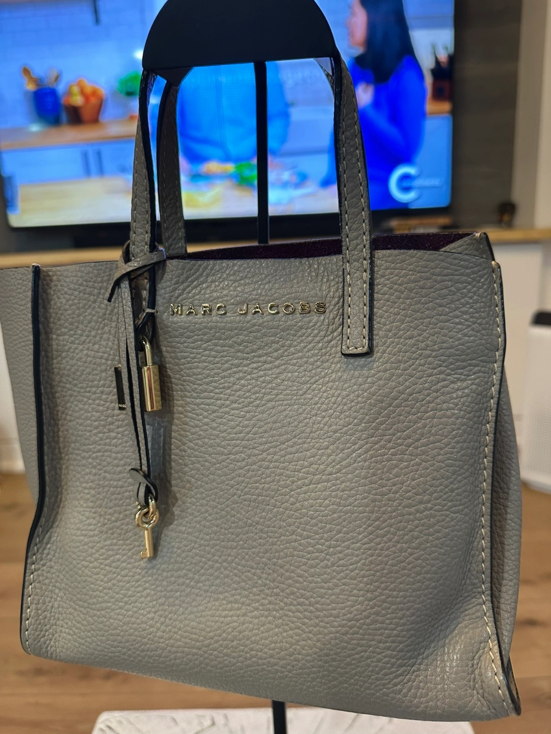 Small taupe leather tote bag. Features top handles and zip closure. Includes a decorative key and lock charm. Burgundy interior lining.