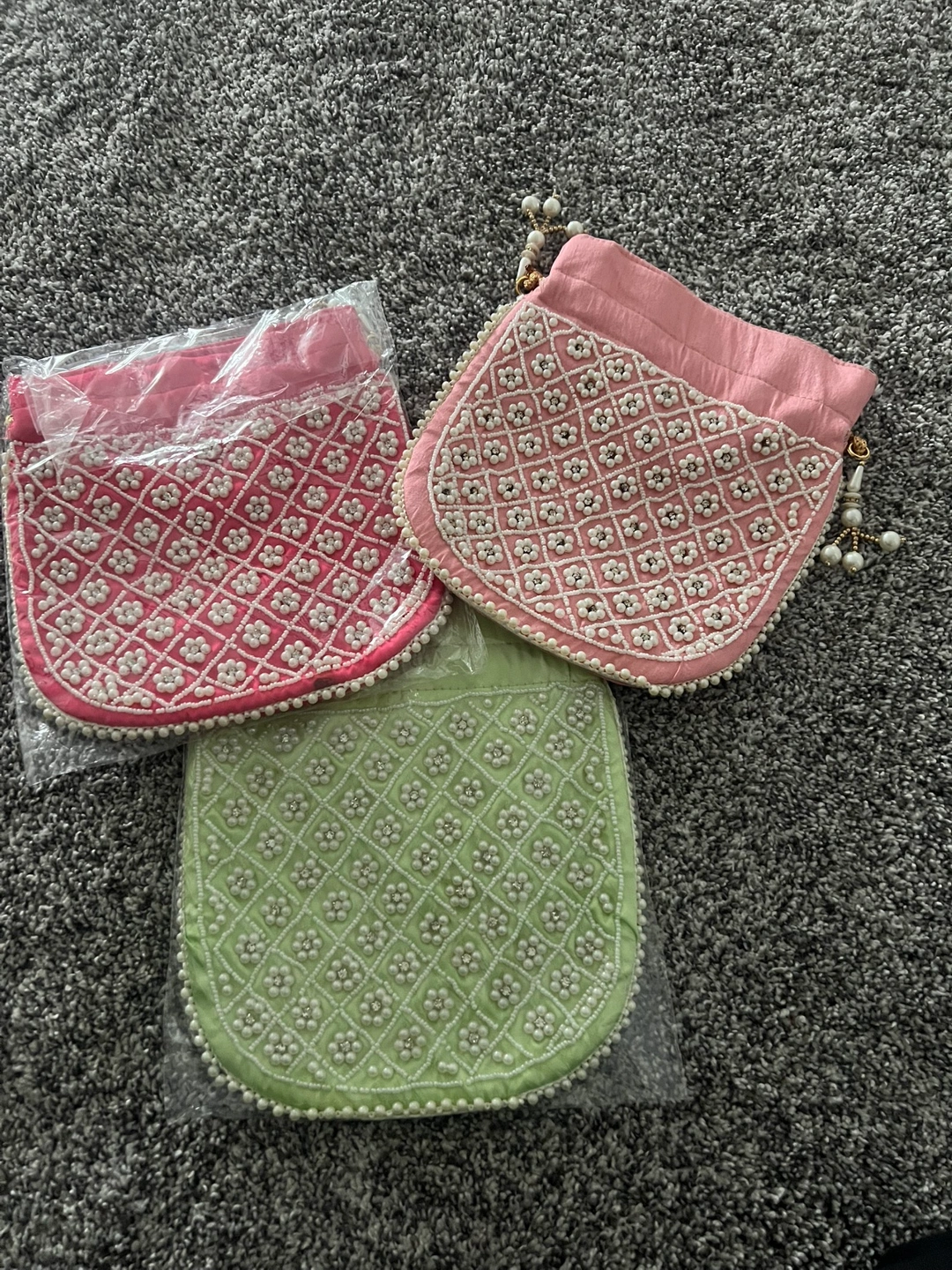 Brand new Set of three beaded bags. Pink, light pink and light green. Pearl embellishments. Drawstring closure. New with tags.