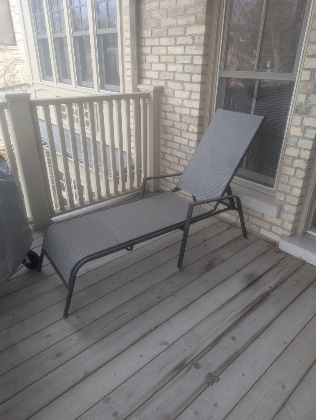 Relaxing grey chaise lounge. Metal frame. Perfect for patio or balcony. Durable fabric. Adjustable backrest. Good shape and looking for a caring and needed new home πŸ’› pickup only :)