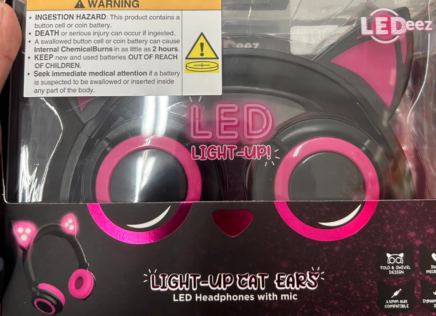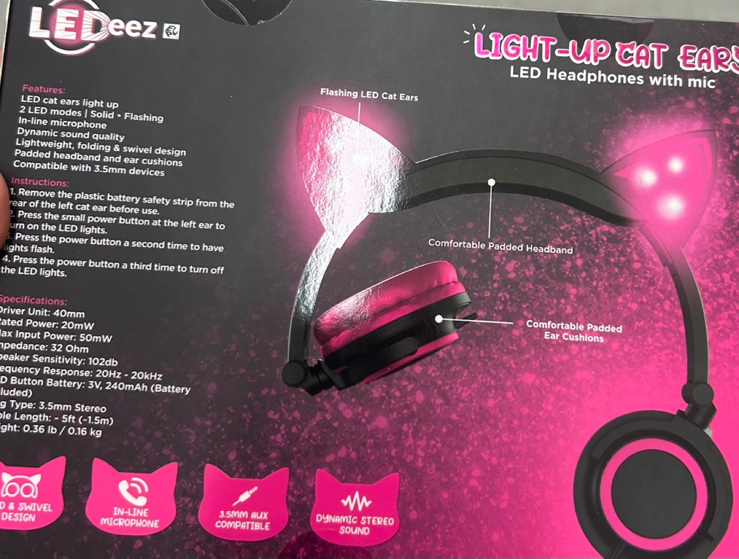 LED cat ears light up. Two sound modes: solid or flashing. In-line microphone. Dynamic stereo sound. Lightweight, folding design. Padded headband and ear cushions. 3.5mm device compatible. Includes instructions.
