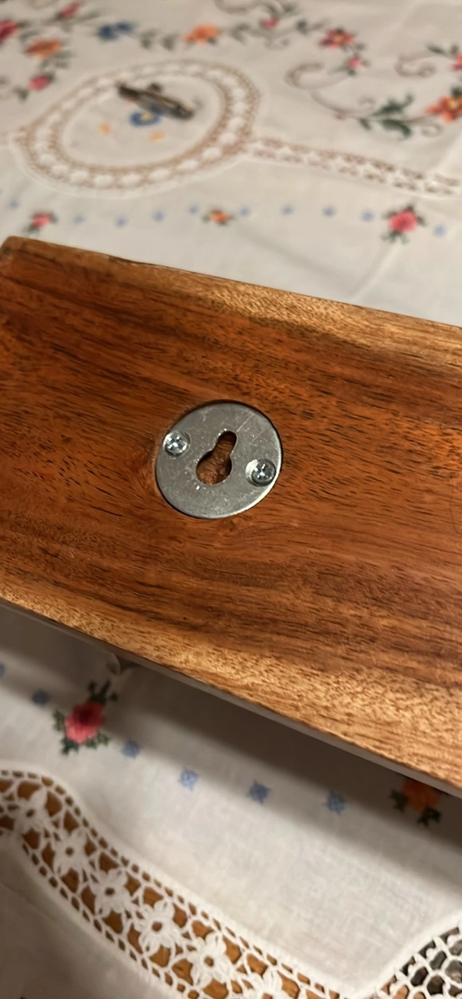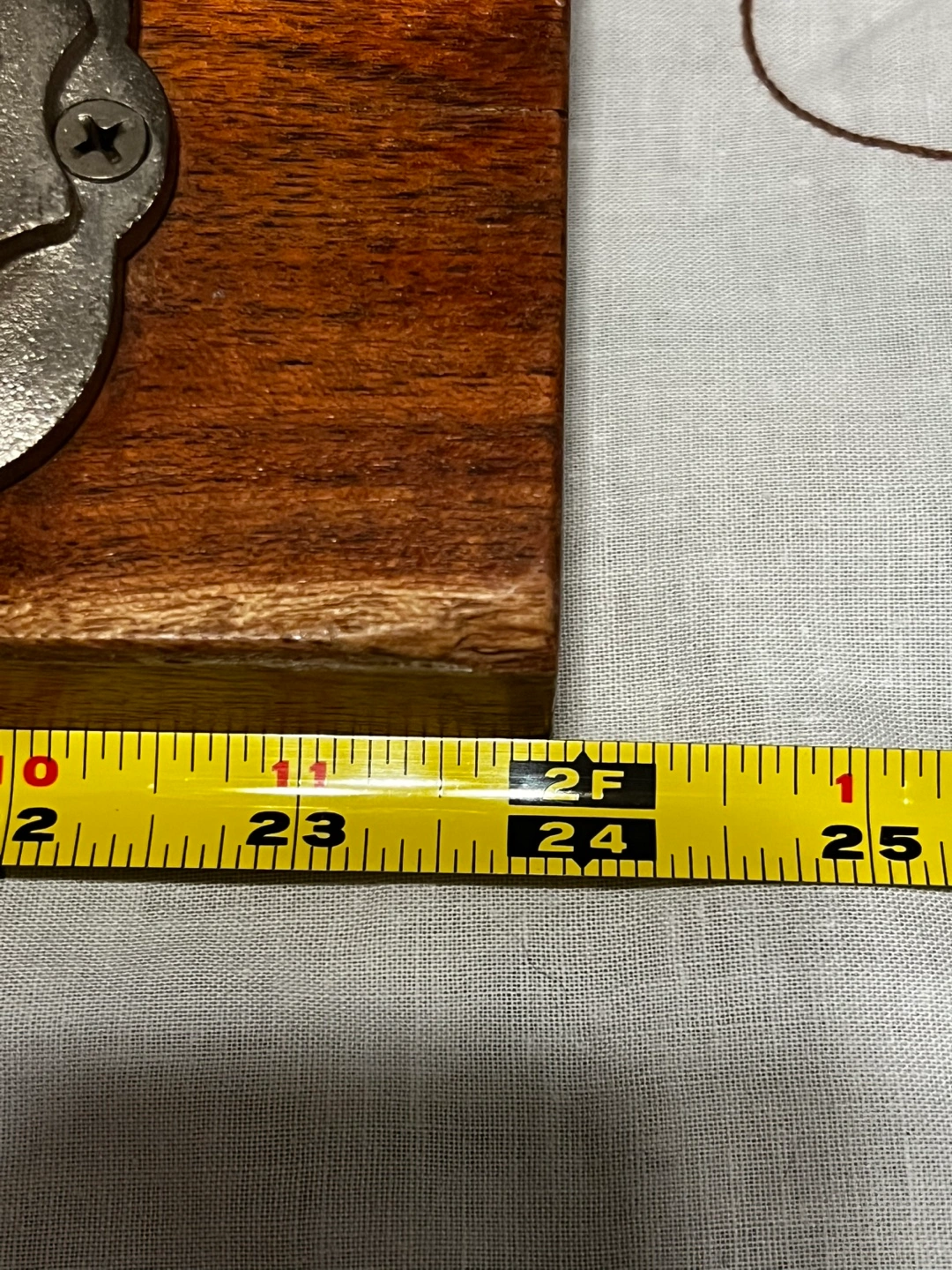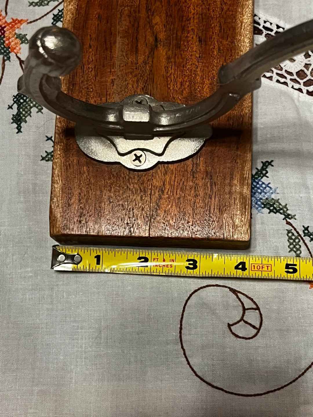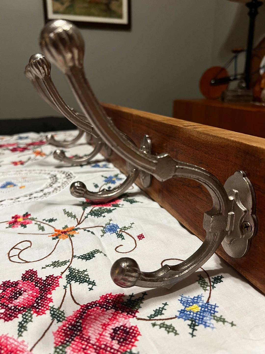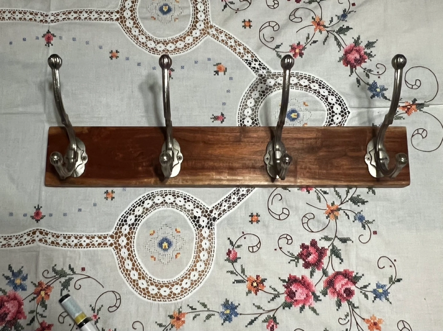 Rustic wooden coat rack. Features three metal hooks. Approximately 24 inches wide. Perfect for entryway or hallway.