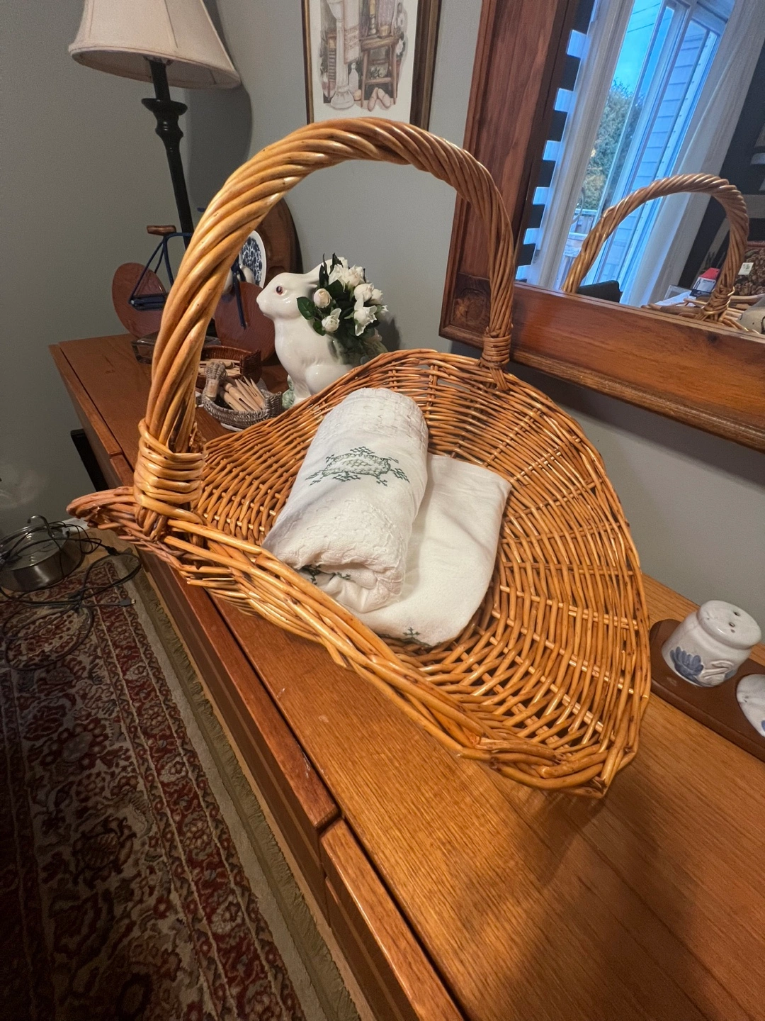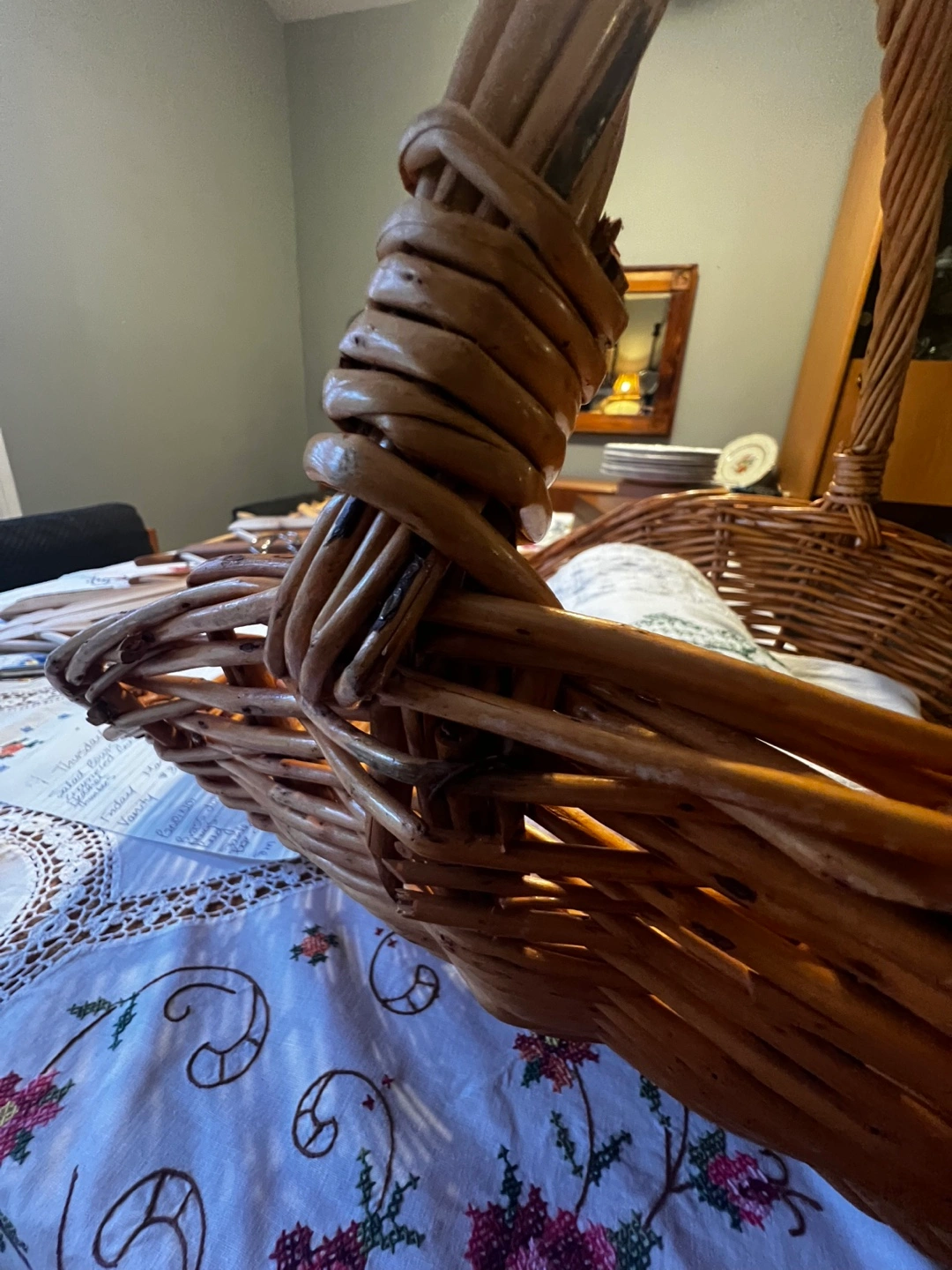 Large, light brown wicker basket. Features a sturdy, curved handle. Gently used.
