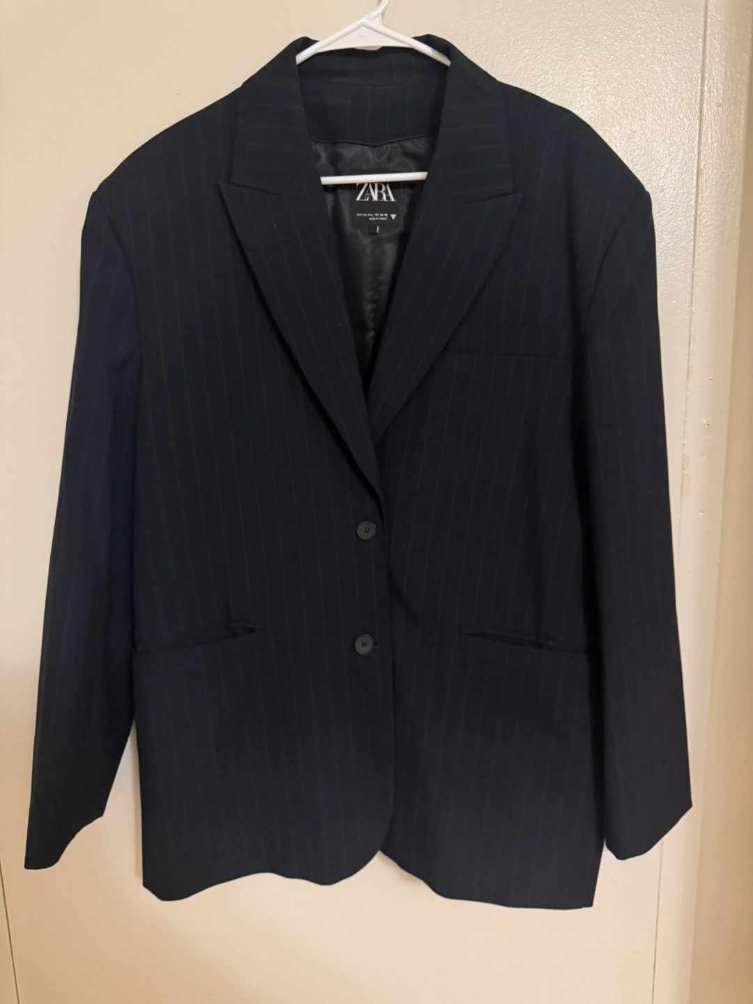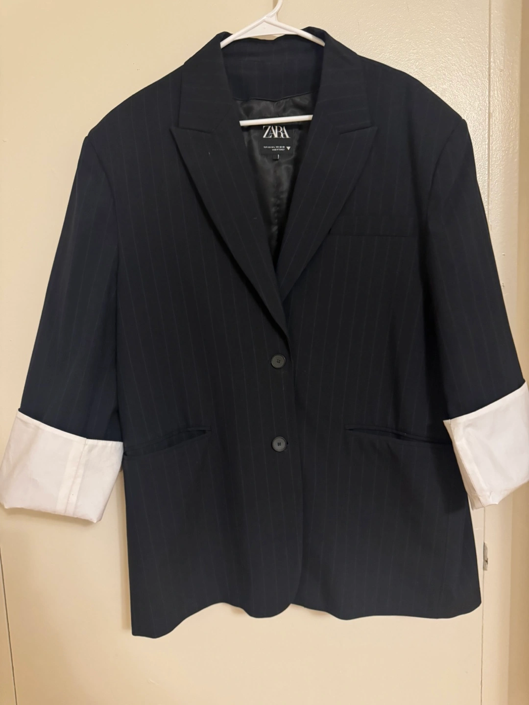 166Oversized Navy blue pinstripe blazer. White contrast detail on cuffs. Two button closure. Comes with garment bag.