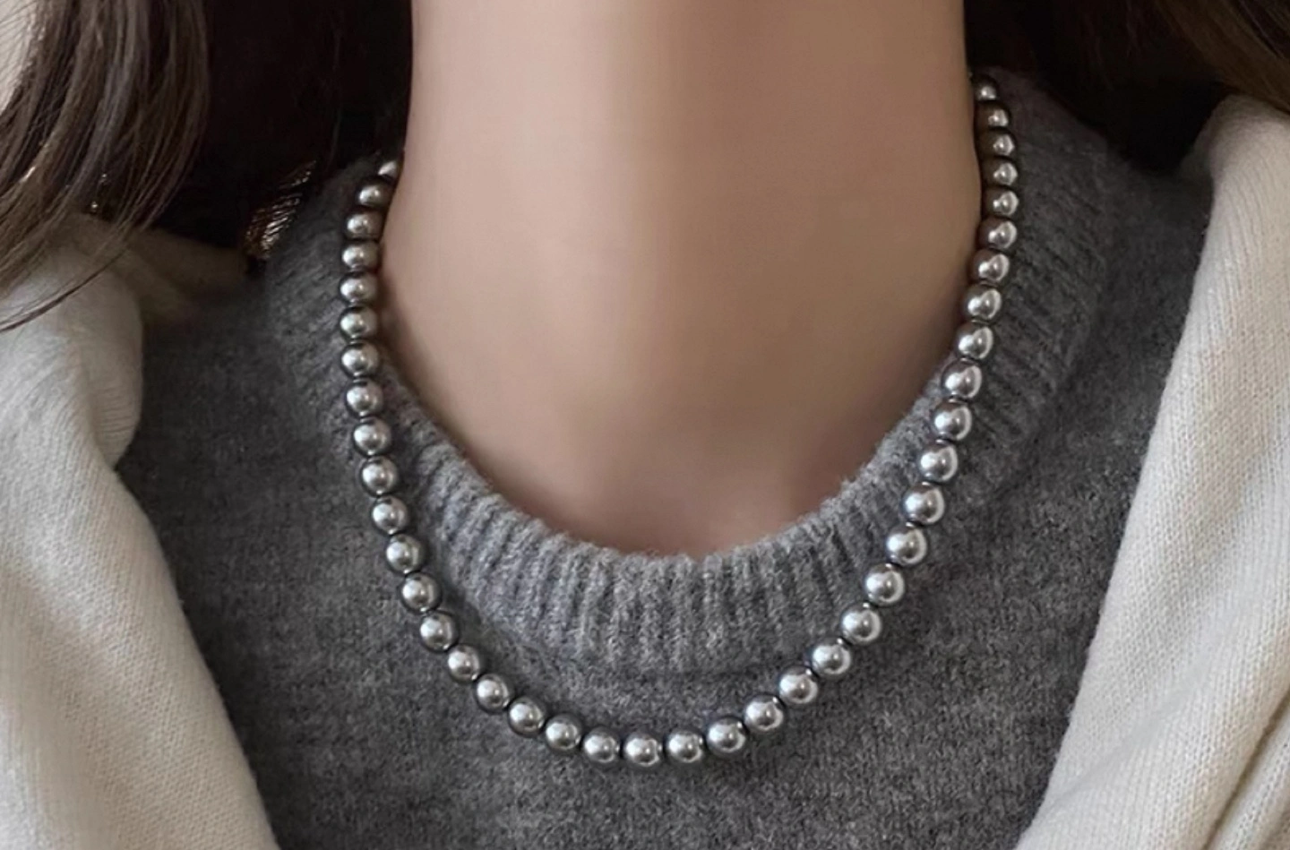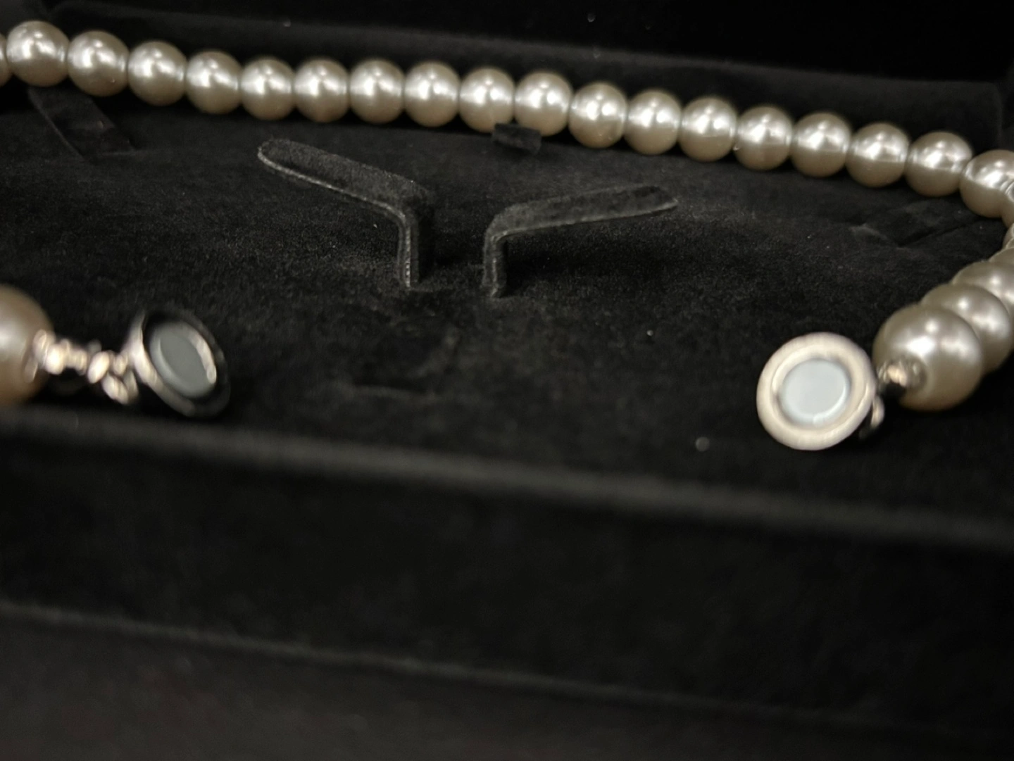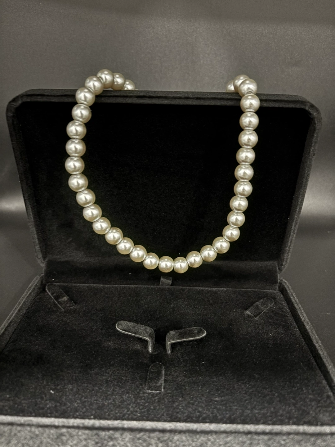 Beautiful pearl necklace (white / grey). Classic design. Magnetic clasp. Perfect for everyday wear or special occasions. Comes in a velvet jewellery box.