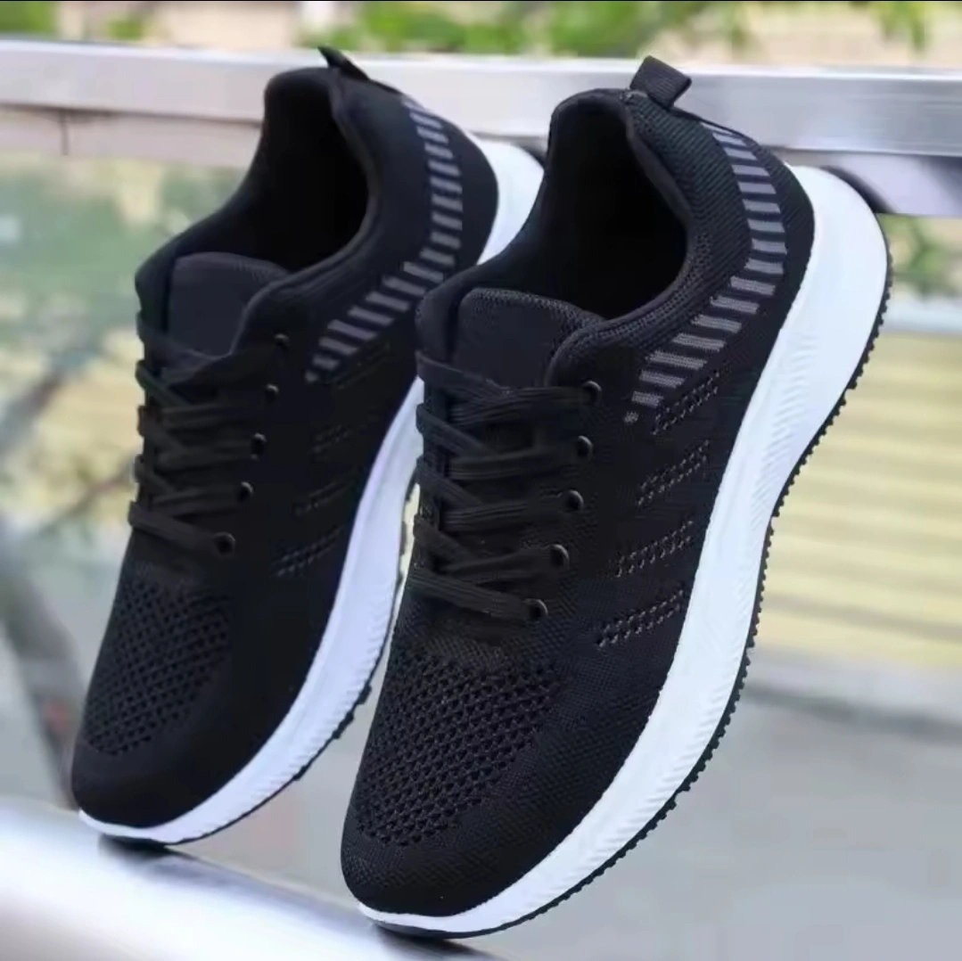 74Pair of black running shoes. Knit upper. White sole. Lace-up closure. Lightweight and breathable.