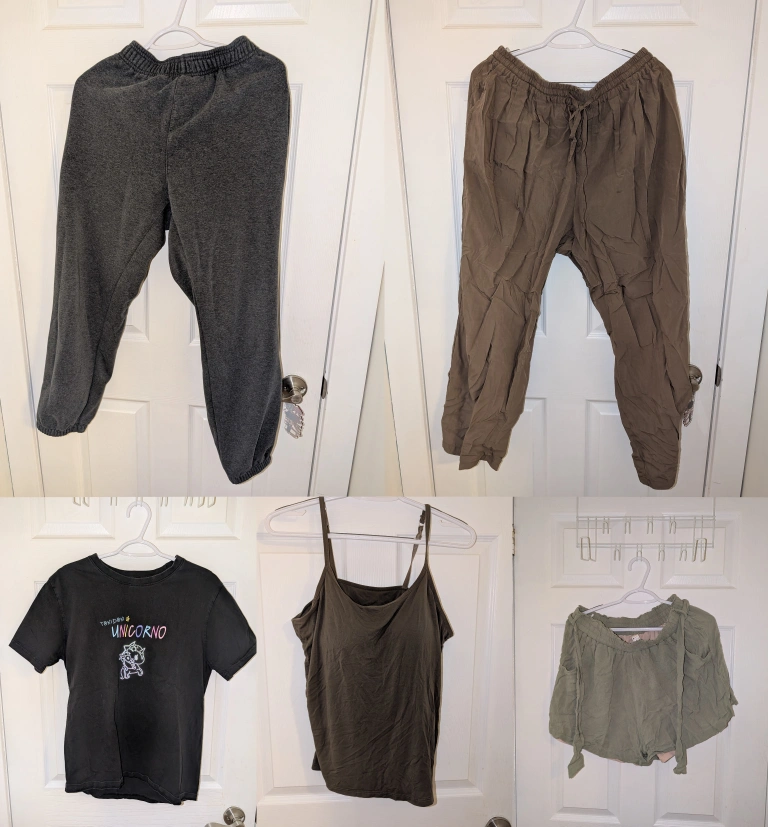 Bundle includes: dark grey sweatpants, olive green loose-fitting pants, black cropped graphic tee, olive green camisole, and olive green pull-on shorts. Various sizes. Good condition. Address: Unionville Porch pick-up only.