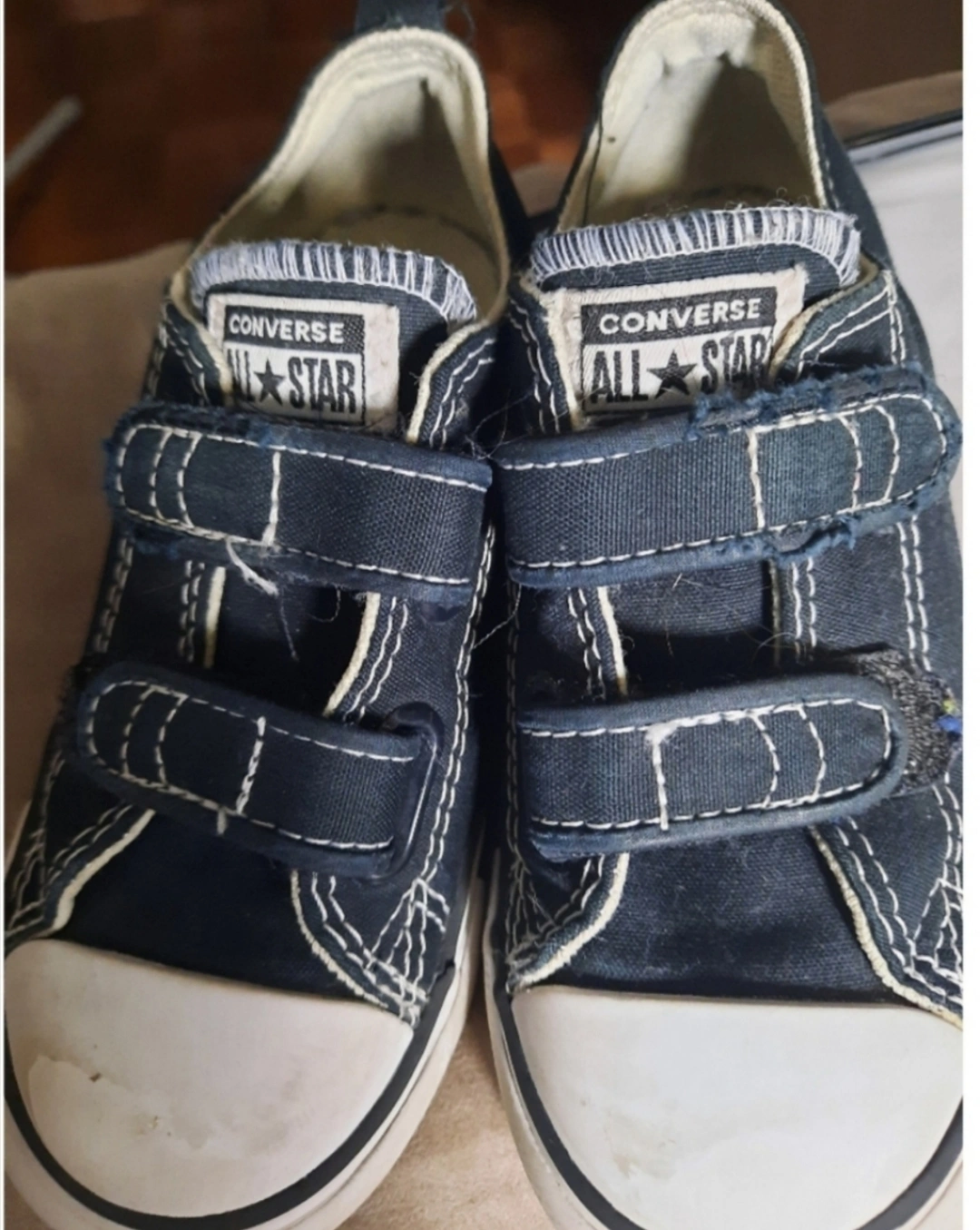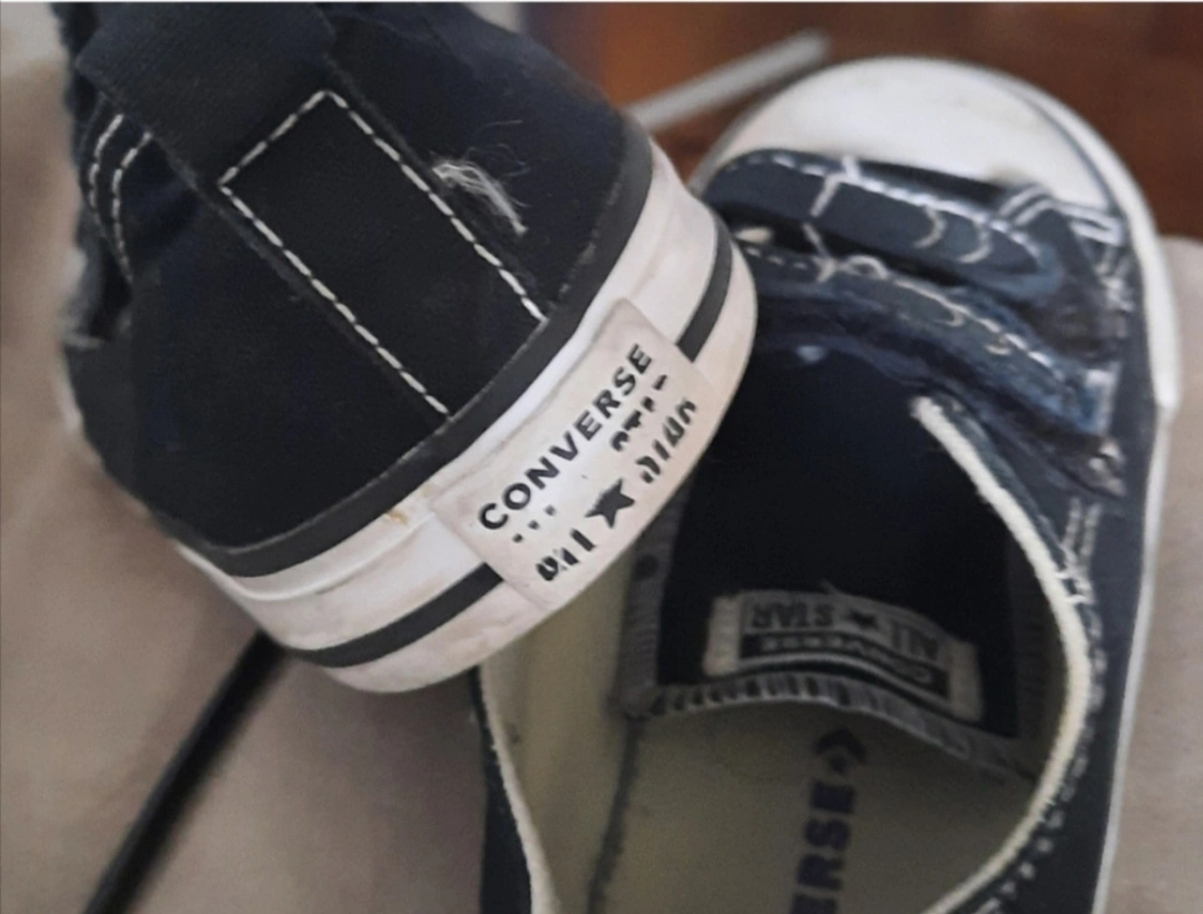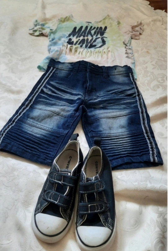 Adorable kids outfit. Includes blue denim shorts with side stripes, a pastel tie-dye shirt, size 3T and a pair of black Converse All Star sneakers with velcro straps size 10. Great for casual wear. missing button from the shorts. never worn.