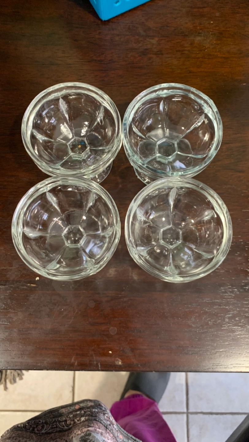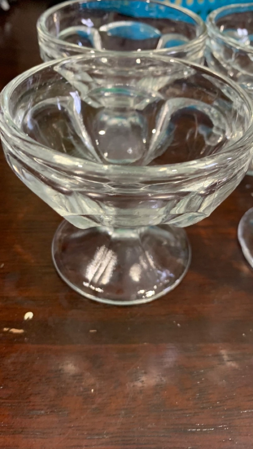 Four footed glass dessert dishes. Clear glass with a textured design. Perfect for serving ice cream, pudding, or other desserts.