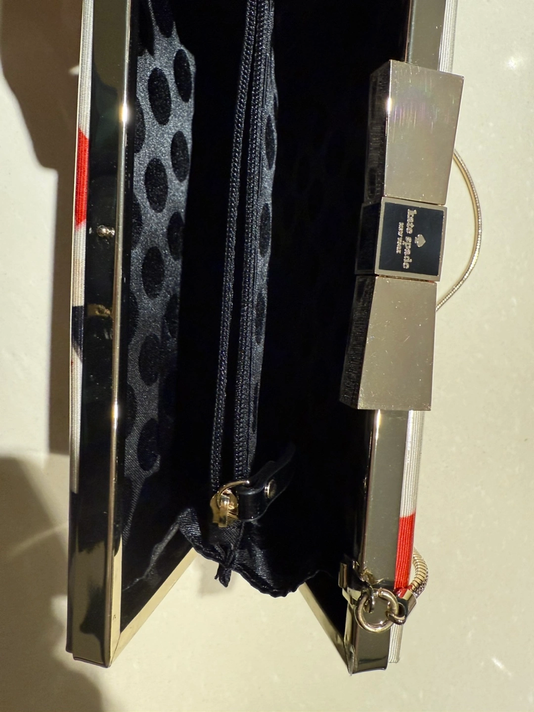 Adorable Kate Spade box clutch. Features a Candy Bow Ties print. Gold chain strap. Black polka dot interior lining. Includes dust bag.