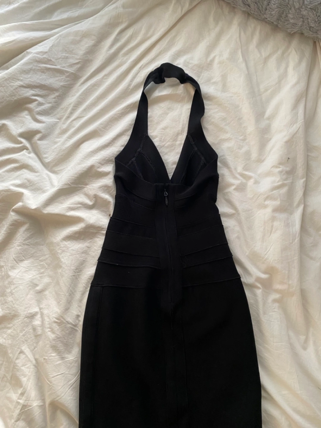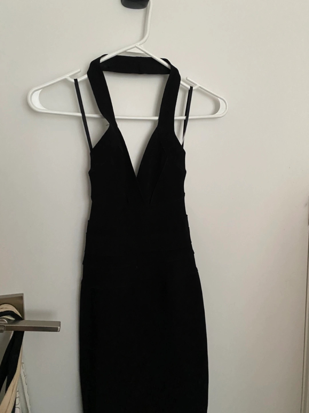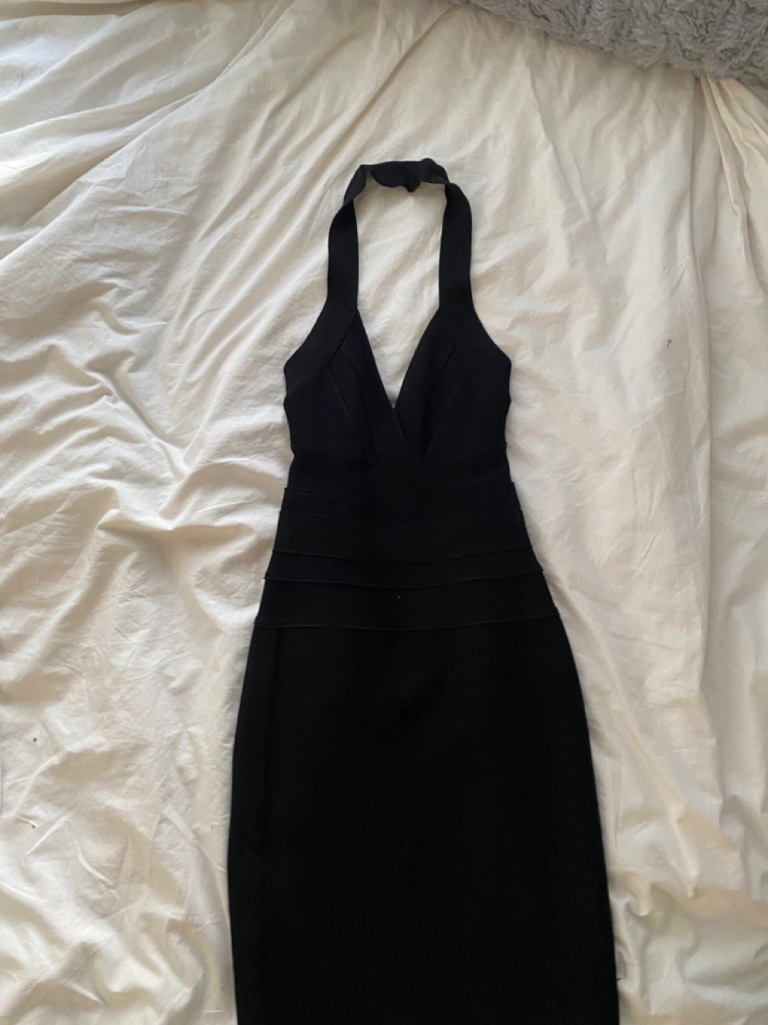Gently worn (less than 5 times) black halter-neck Babaton bandage dress. Thick, figure-hugging fabric. Midi length.
