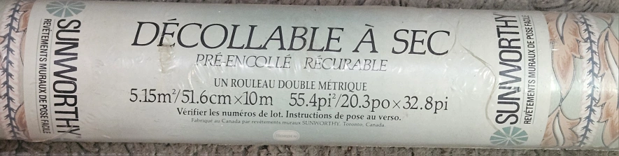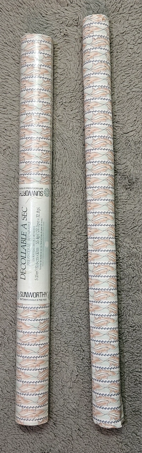 119Two rolls of pre-pasted, scrubbable, dry strippable wallpaper. One metric double roll. Features a beige and blue pattern. Made in Canada.