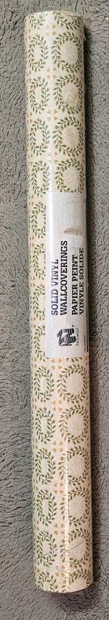 119Unused roll of wallpaper. Floral pattern, green and gold on an off-white background. Made in Canada. Still in original packaging.
