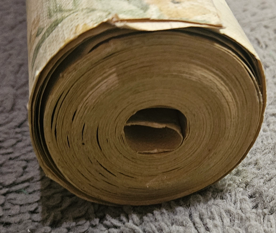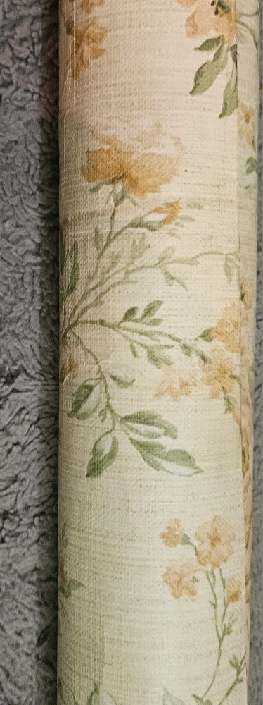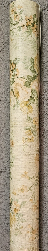 119Unused roll of vintage wallpaper. Features a delicate floral pattern in peach and green tones. Cream-coloured background. Perfect for a vintage or shabby chic aesthetic.