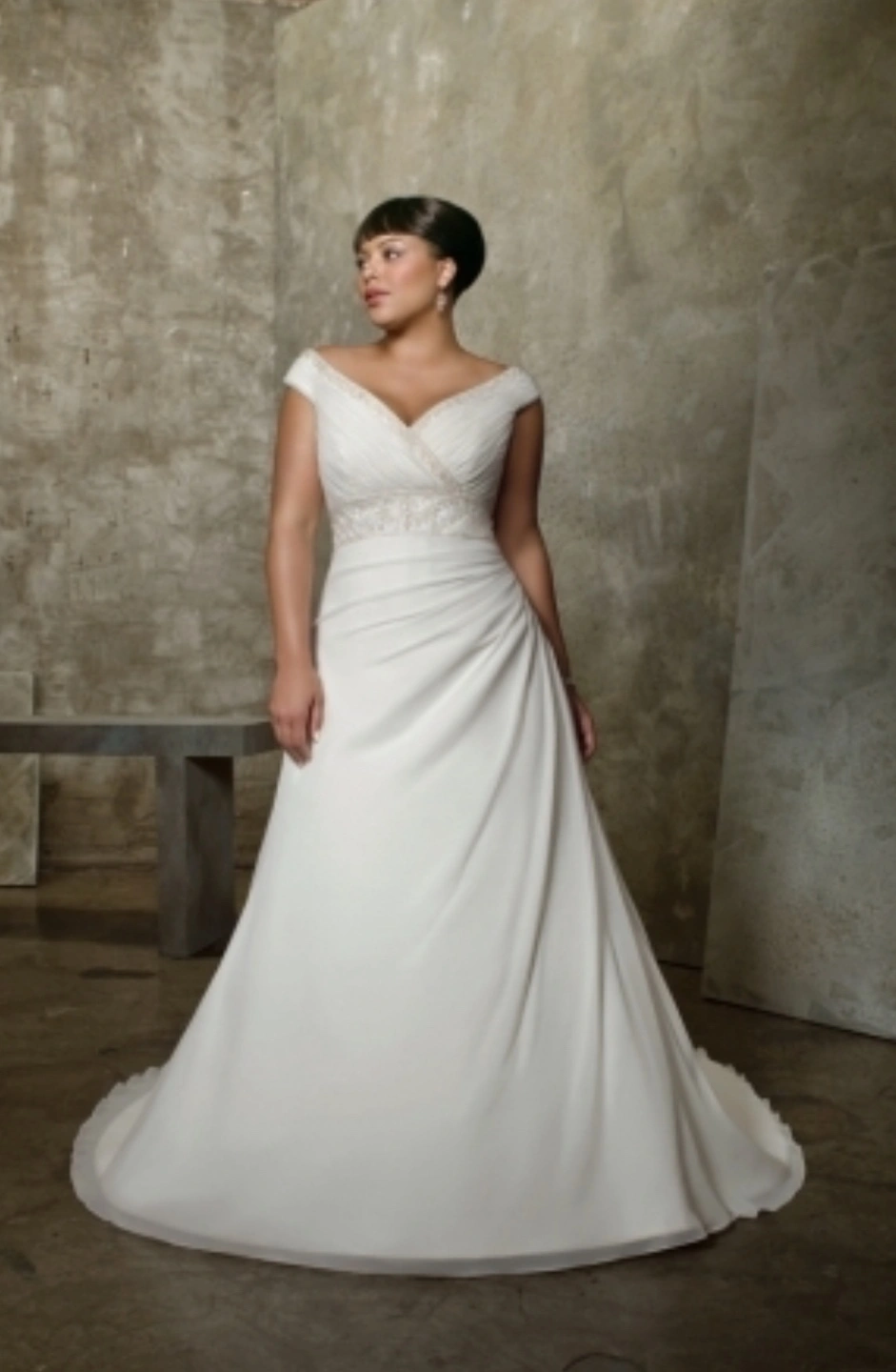 Gorgeous off-the-shoulder chiffon wedding gown. Features a V-neckline, empire waist, and subtle beading. Floor-length with a sweep train. Perfect for a classic bridal look. Professionally cleaned and boxed.