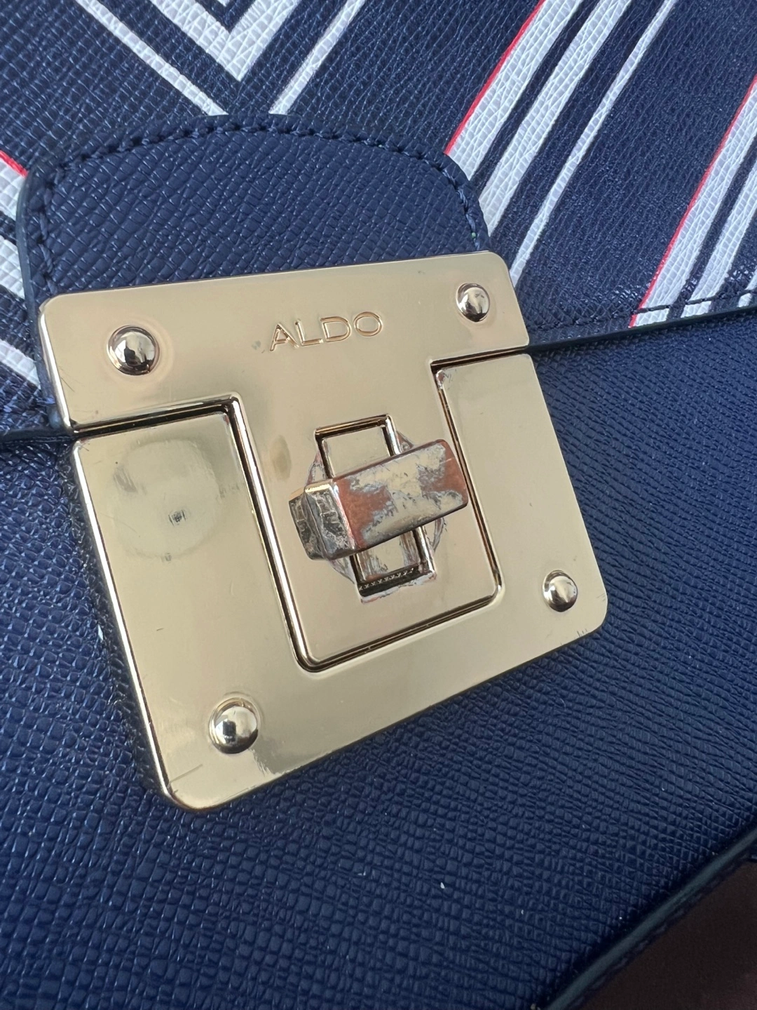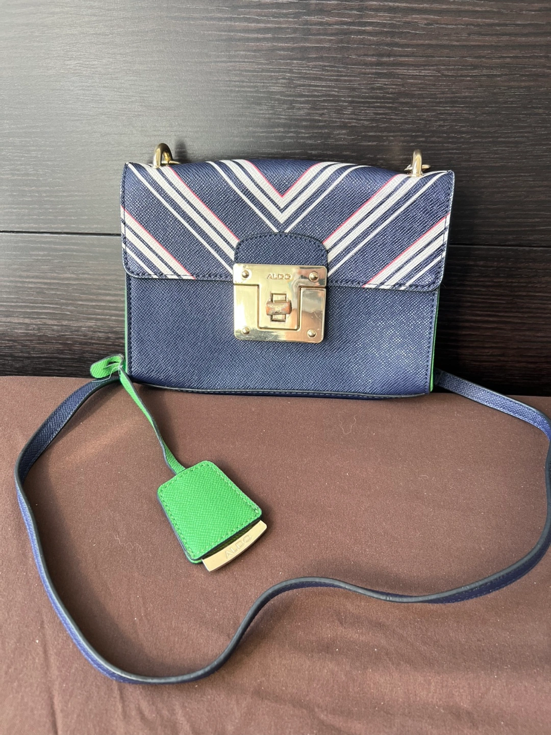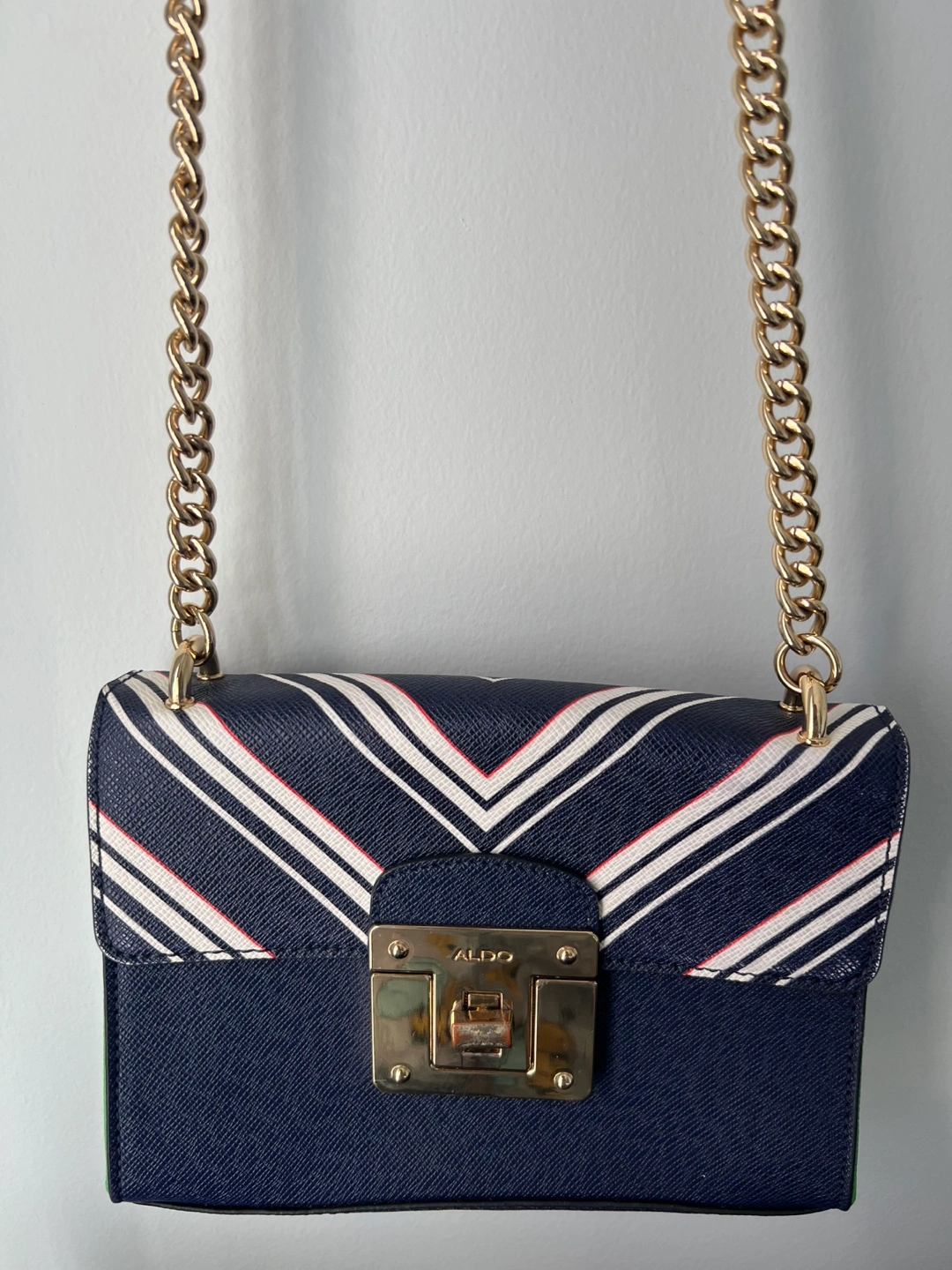 Features a navy and white chevron pattern flap, gold chain strap, and a dark green back panel