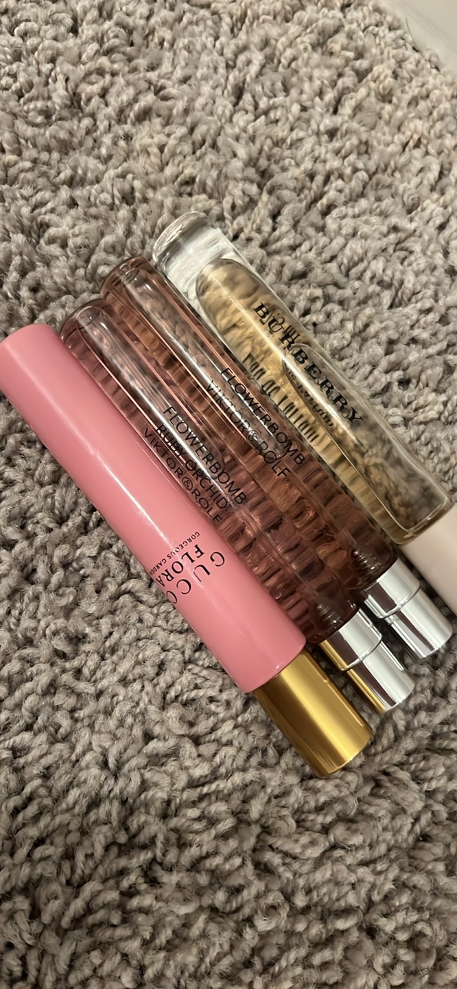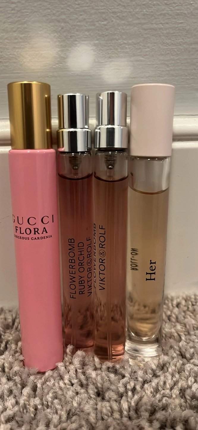 Set of four mini perfumes. Includes Gucci Flora Gorgeous Gardenia, Viktor & Rolf Flowerbomb Ruby Orchid, Great for travel or trying new scents.