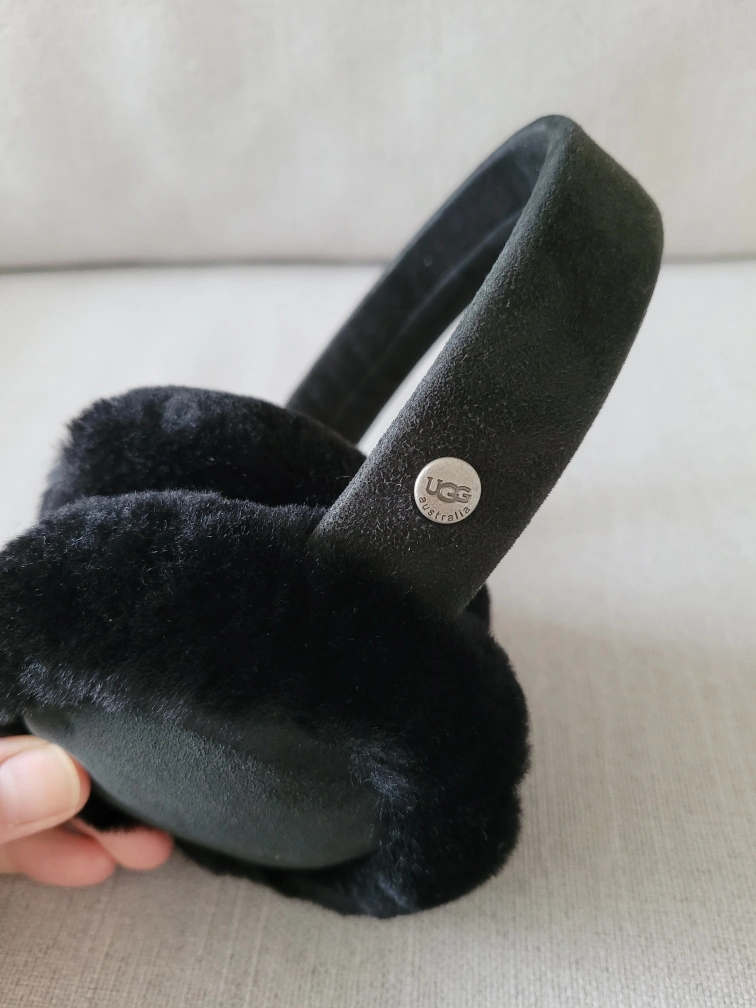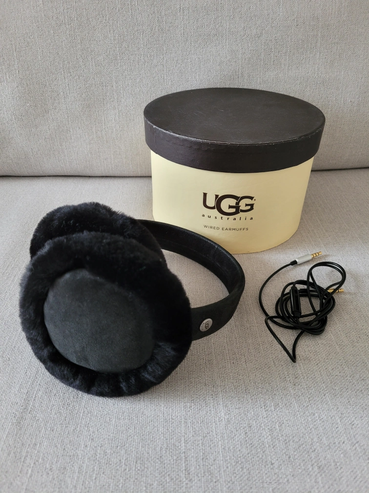 281Black sheepskin earmuffs. Wired, so you can listen to music. Comes with original box. Excellent condition.