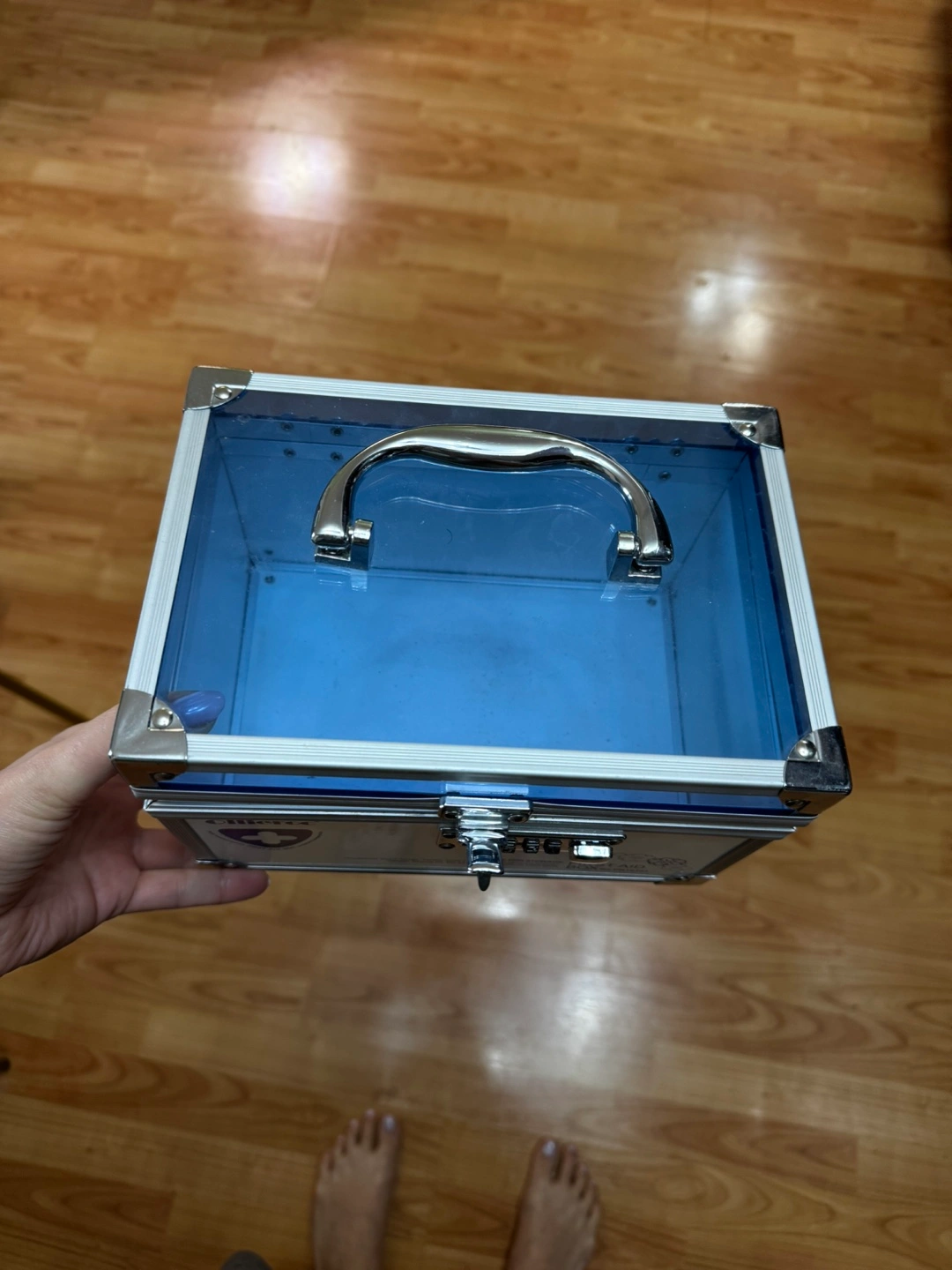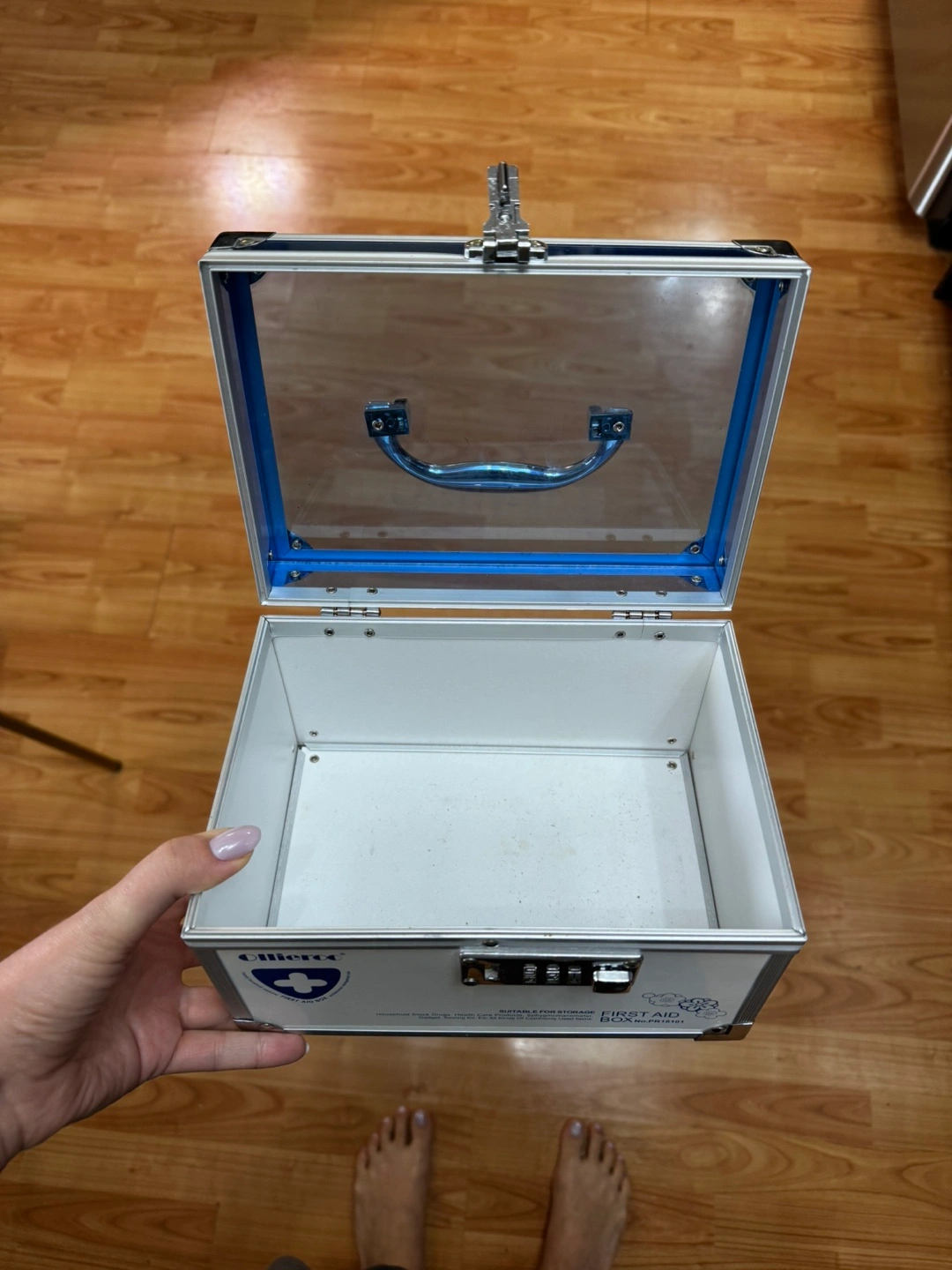 Aluminum case with a clear plastic top. Features a combination lock and carrying handle. Suitable for household storage.