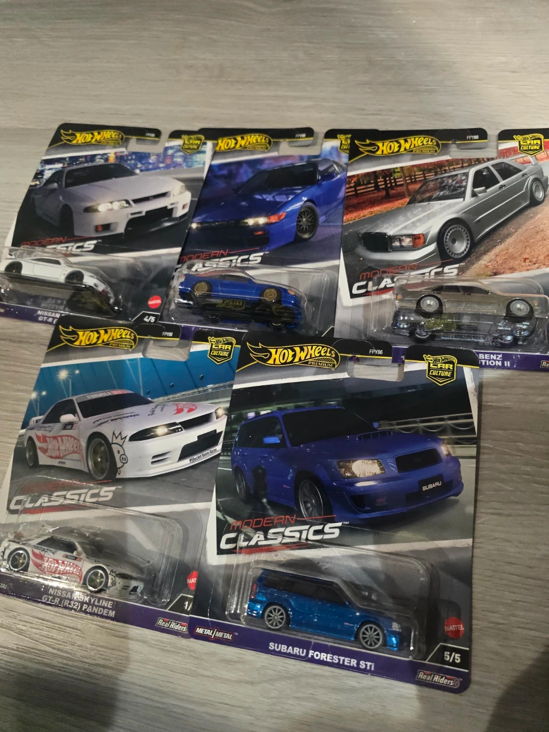 This lot includes several Hot Wheels Car Culture premium die-cast cars. Models identified include the Nissan Skyline GT-R (R32) Pandem and Subaru Forester STI. These are collectible 1/64 scale models.