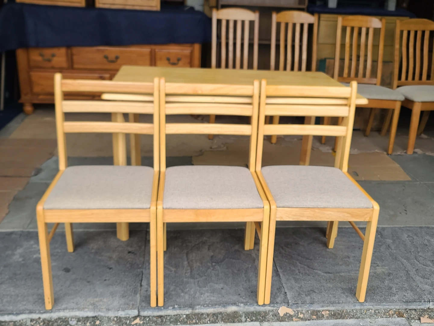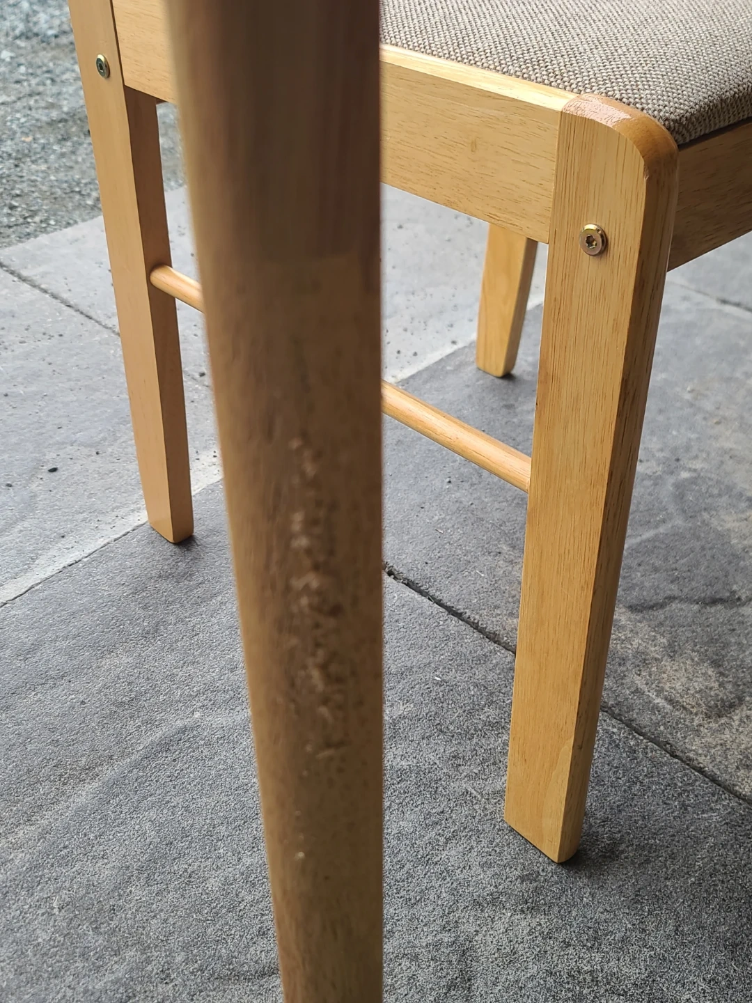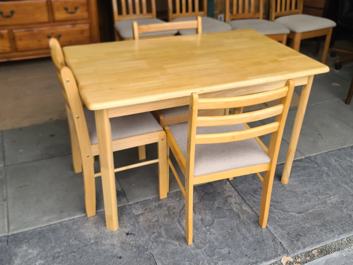 Light wood dining set, comes with 3 chairs. Upholstered seats on chairs. Great for a small space or kitchen nook. The chairs have beige fabric seats. Measurements: W 47" X D 29" X H 29". Delivery can be arranged. Viewing and pickup by appointment.
