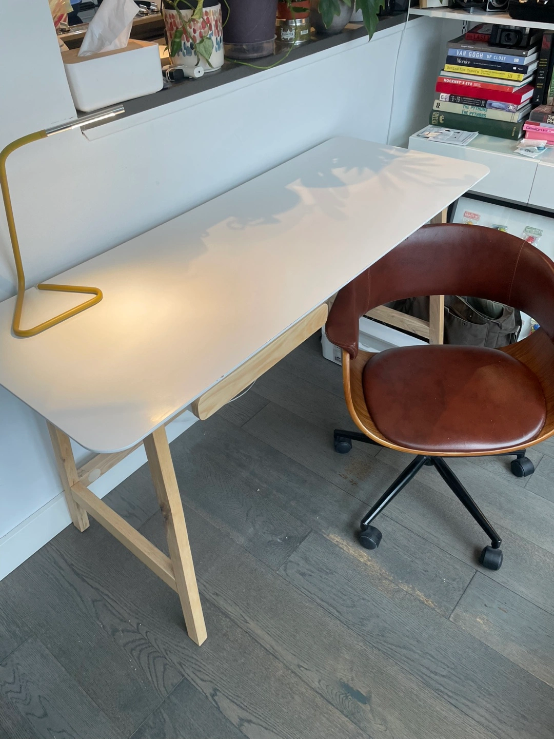 Modern looking desk. White laminate top and light coloured wood legs.