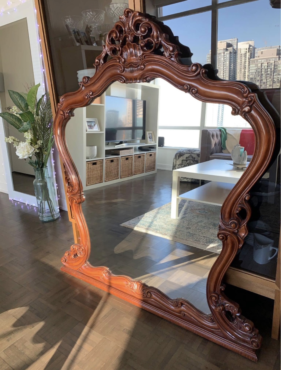 Beautiful large solid wood vintage mirror, with a wire on the back to hang it.
