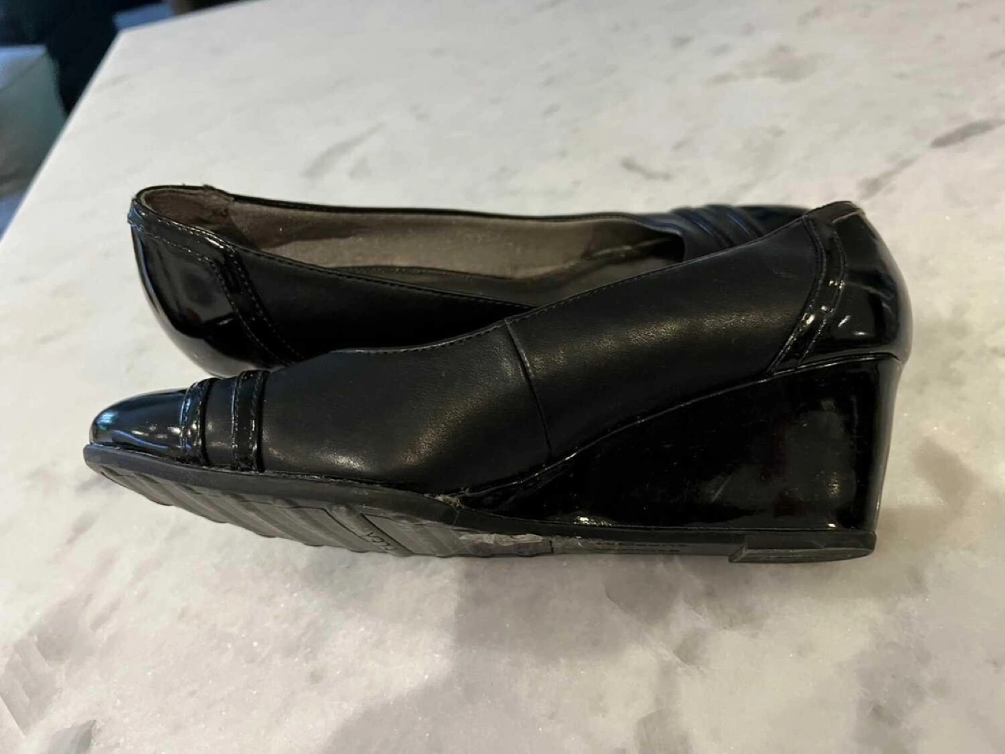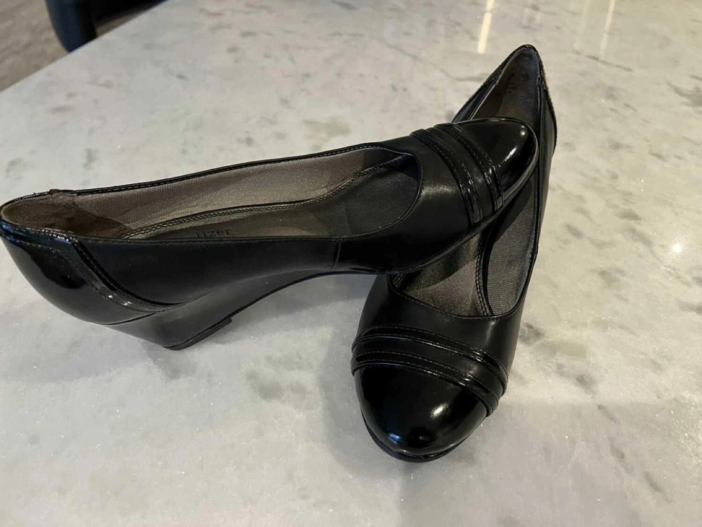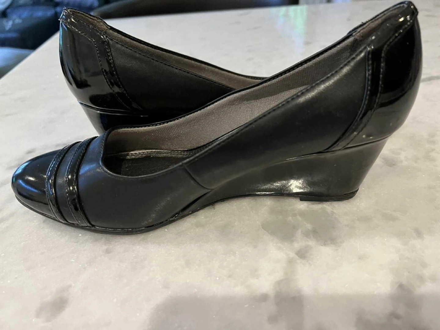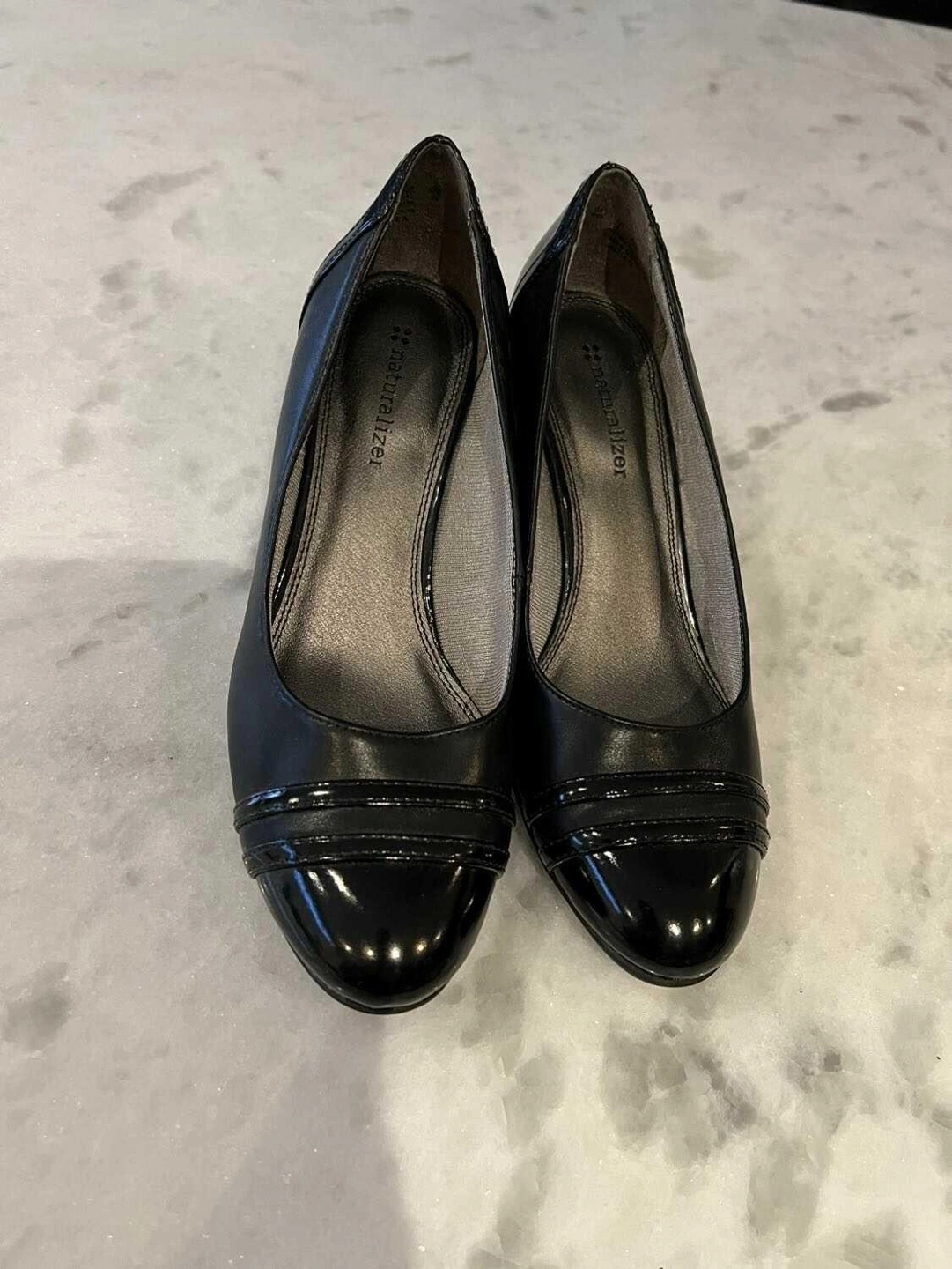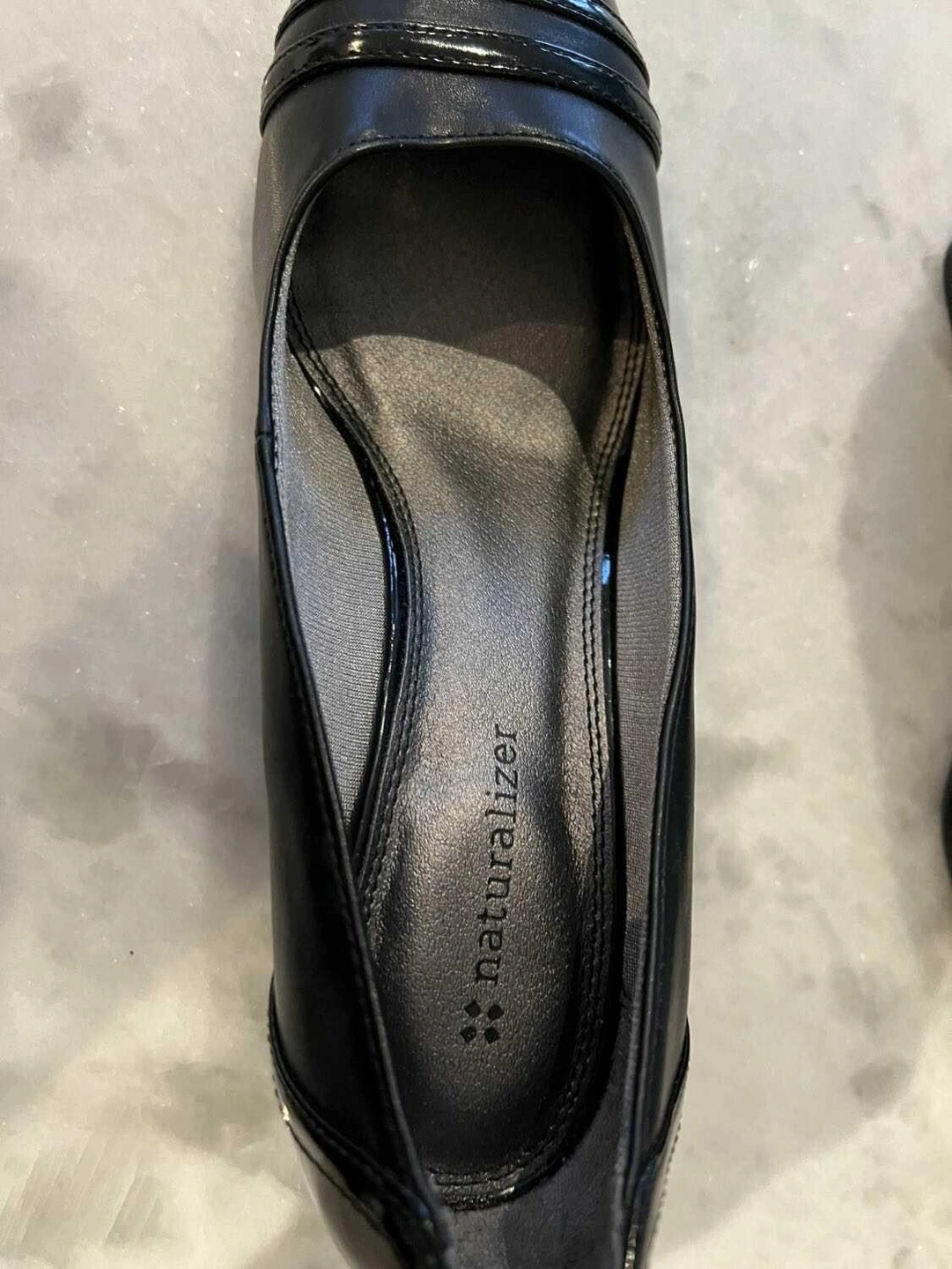 108NATURALIZER SIZE 9 New Condition - never worn. Women's black leather wedge heels. Patent leather accents. Size 9.