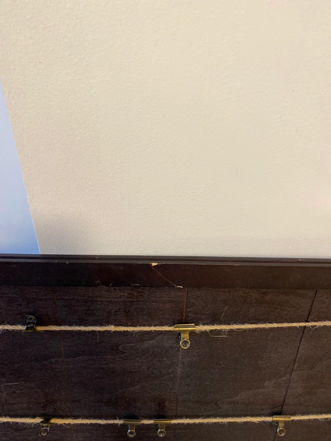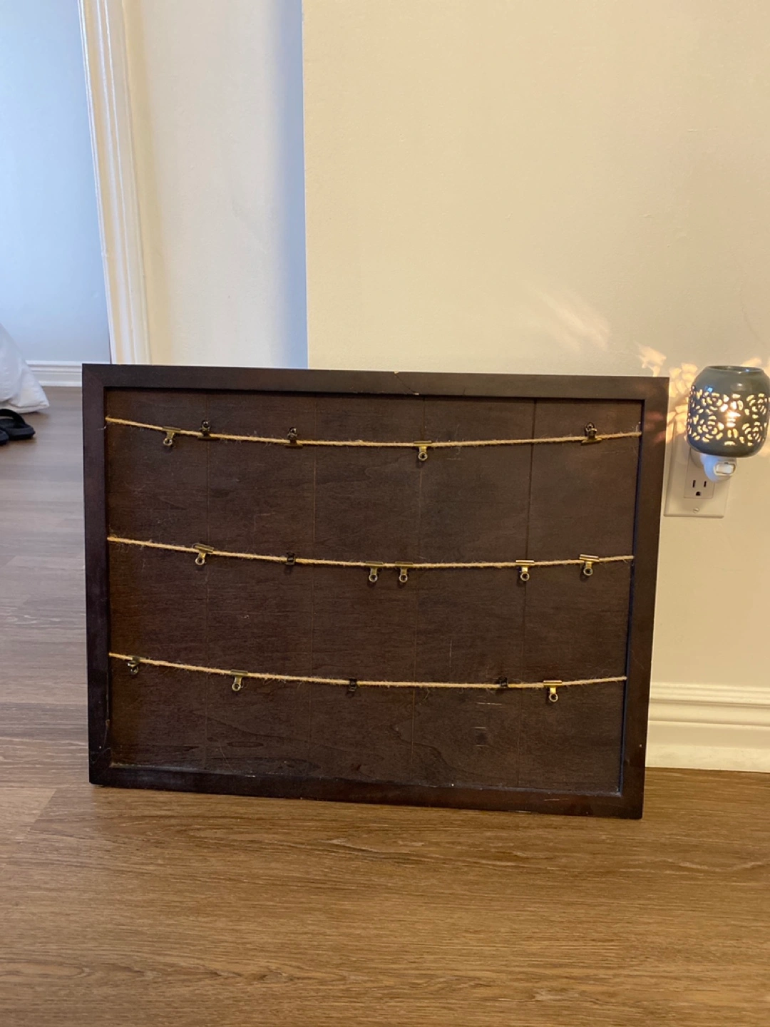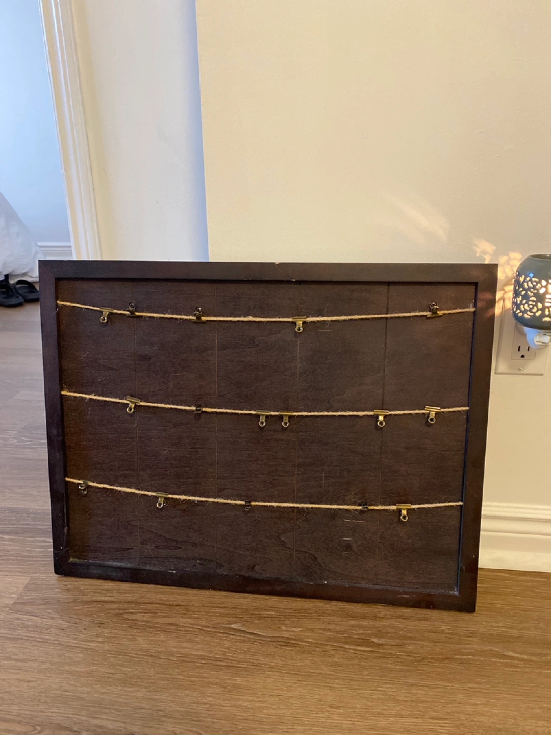 Dark brown wooden frame with attached twine and small gold clips. Perfect for displaying photos or other small mementos. Minor damage to frame. Pick up near St Clair W and Christie