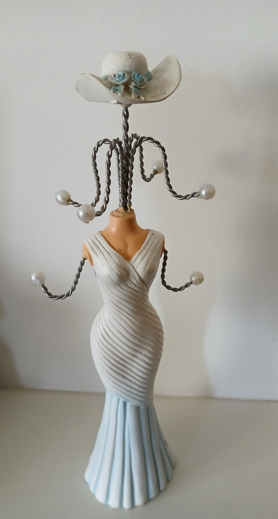Beautiful mannequin jewelry holder. Features a stylish design, perfect for displaying necklaces, earrings, and bracelets. Includes a charming hat detail. Unique and eye-catching piece for your dresser or vanity.