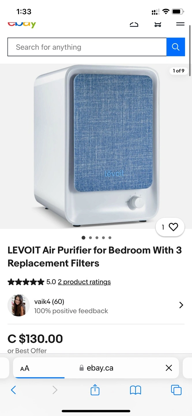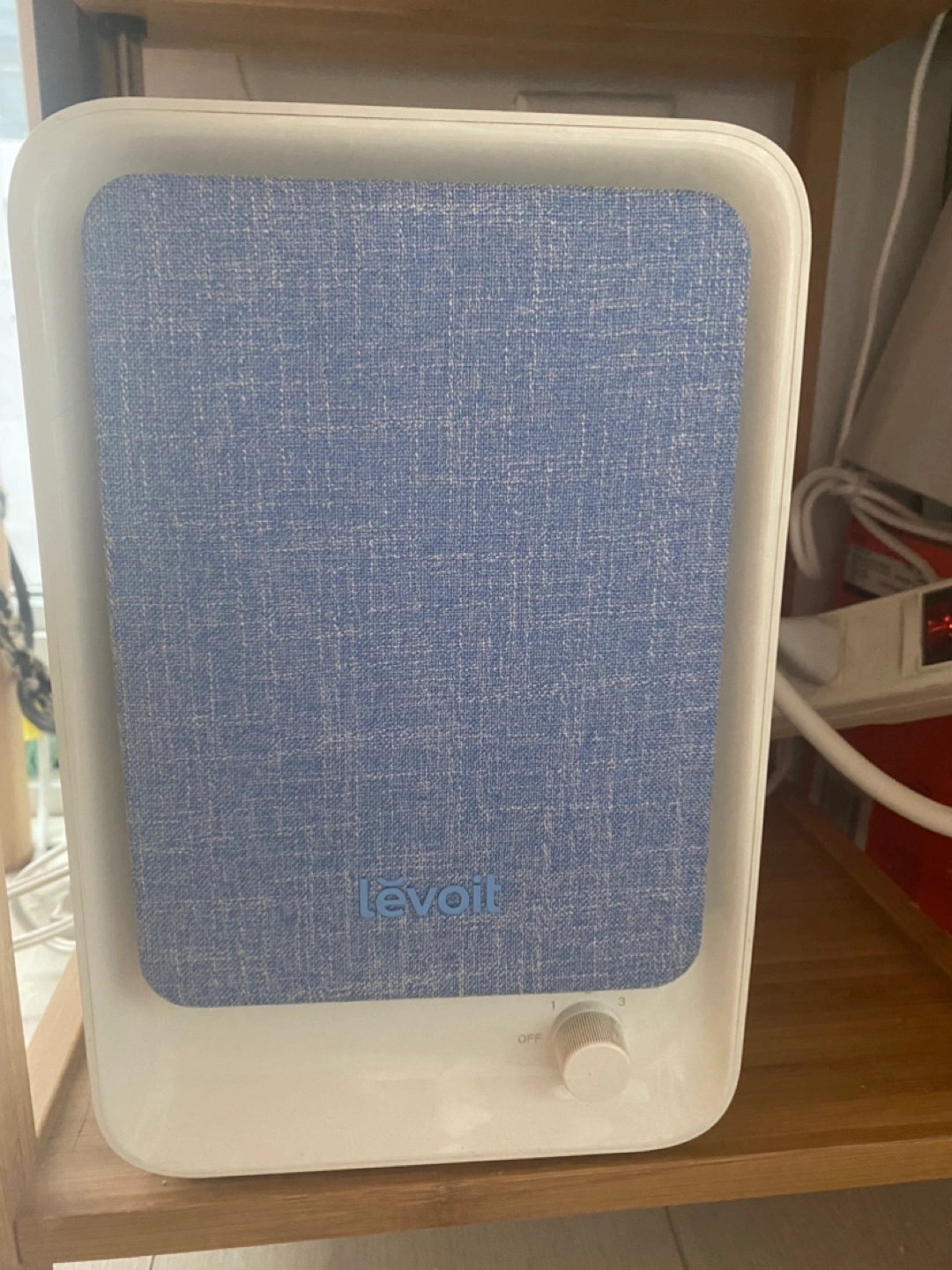 Compact air purifier. Features a blue fabric exterior. Includes a control dial. HEPA filter. Good for bedrooms.