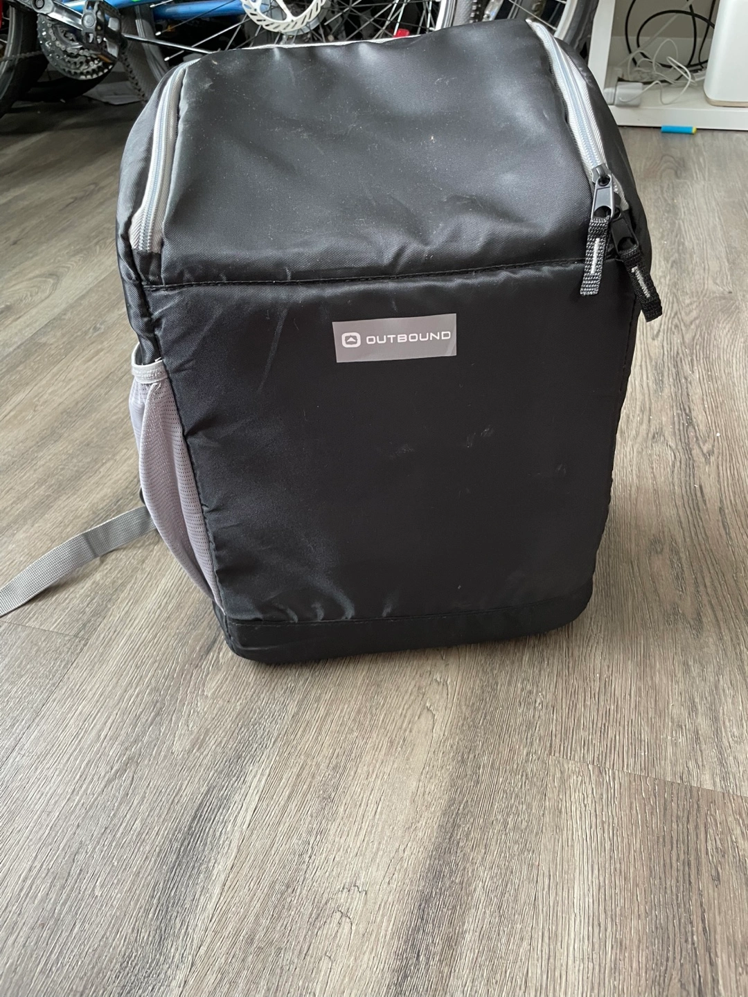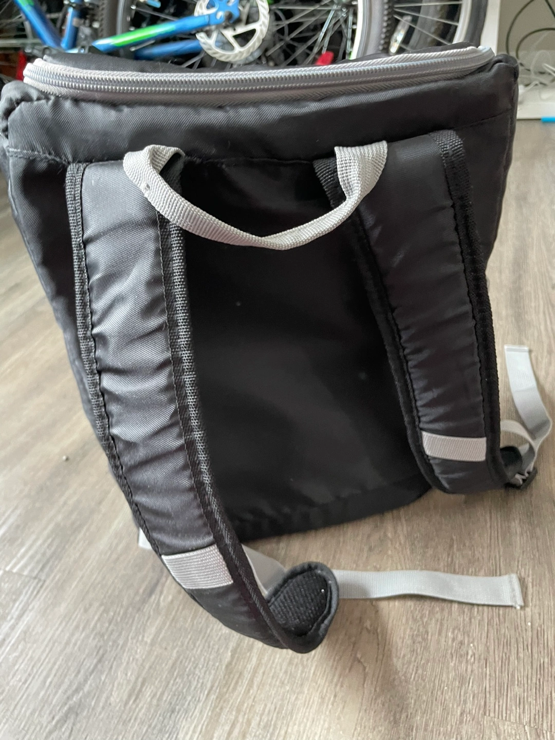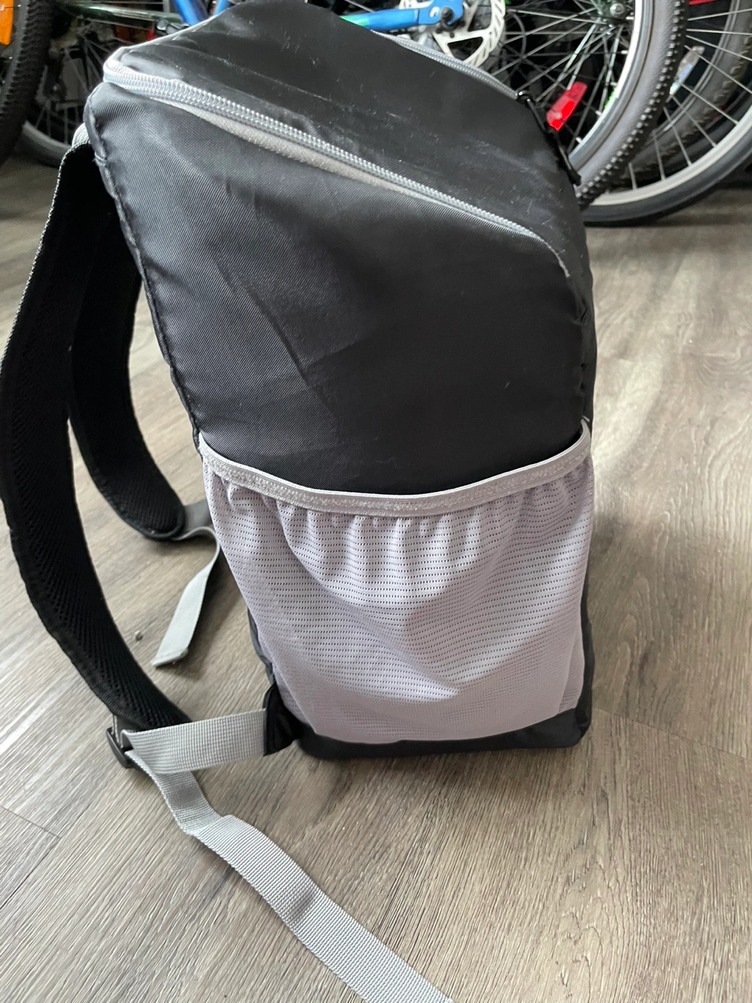 Black insulated backpack cooler. Features zippered main compartment, side mesh pocket, and adjustable shoulder straps. Made in China.