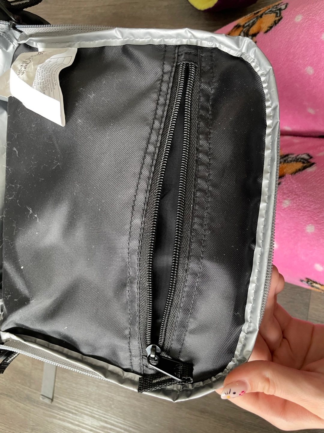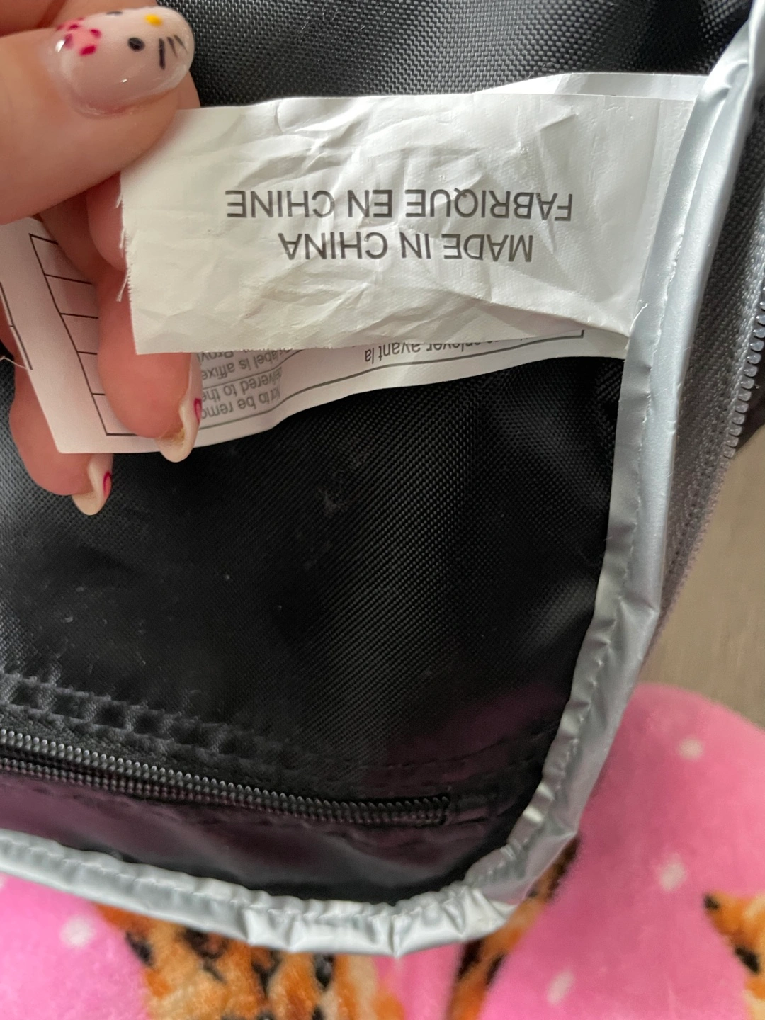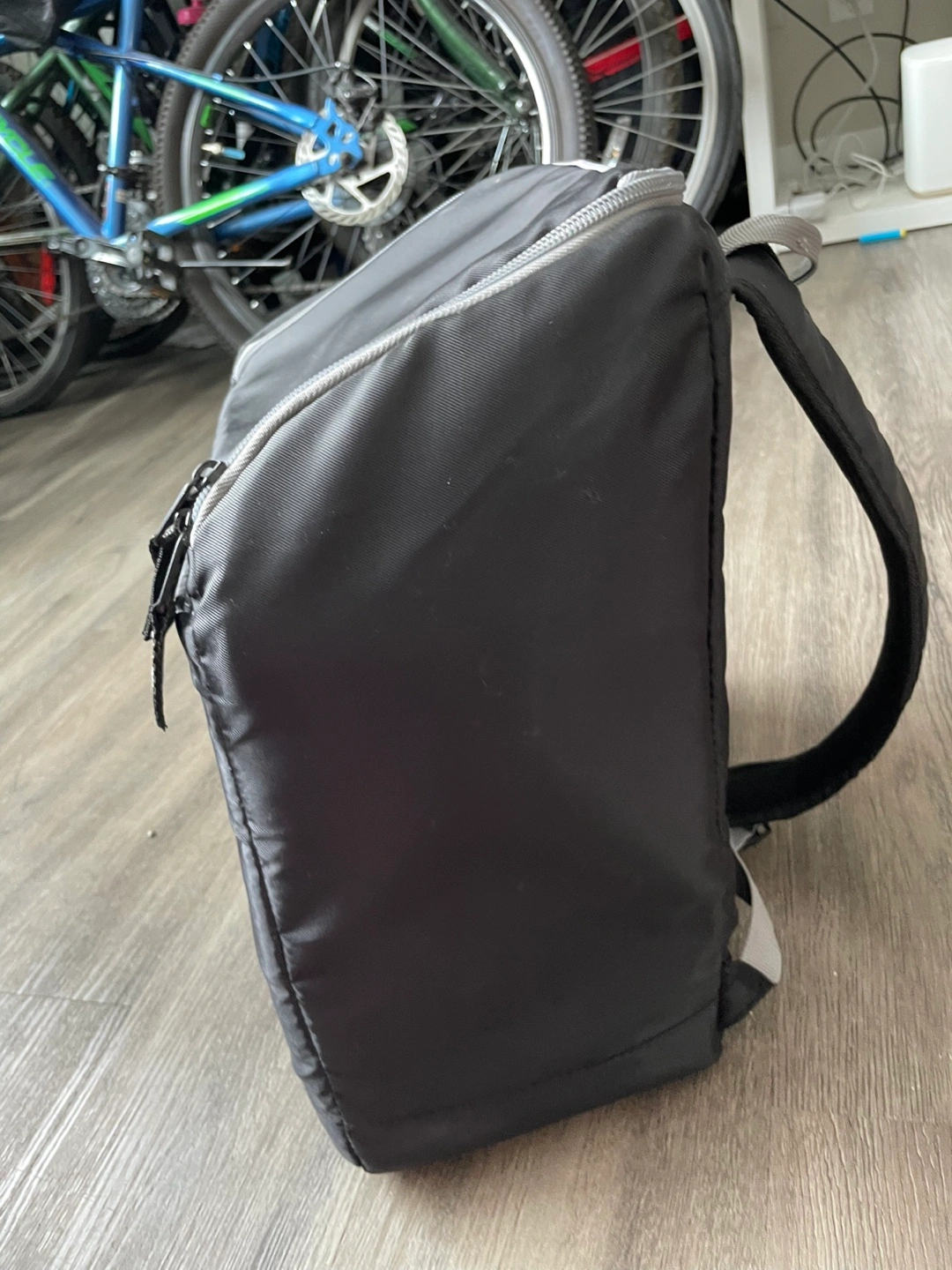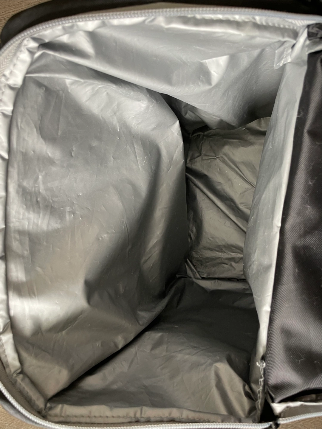 Black insulated backpack cooler. Features zippered main compartment, side mesh pocket, and adjustable shoulder straps. Made in China.