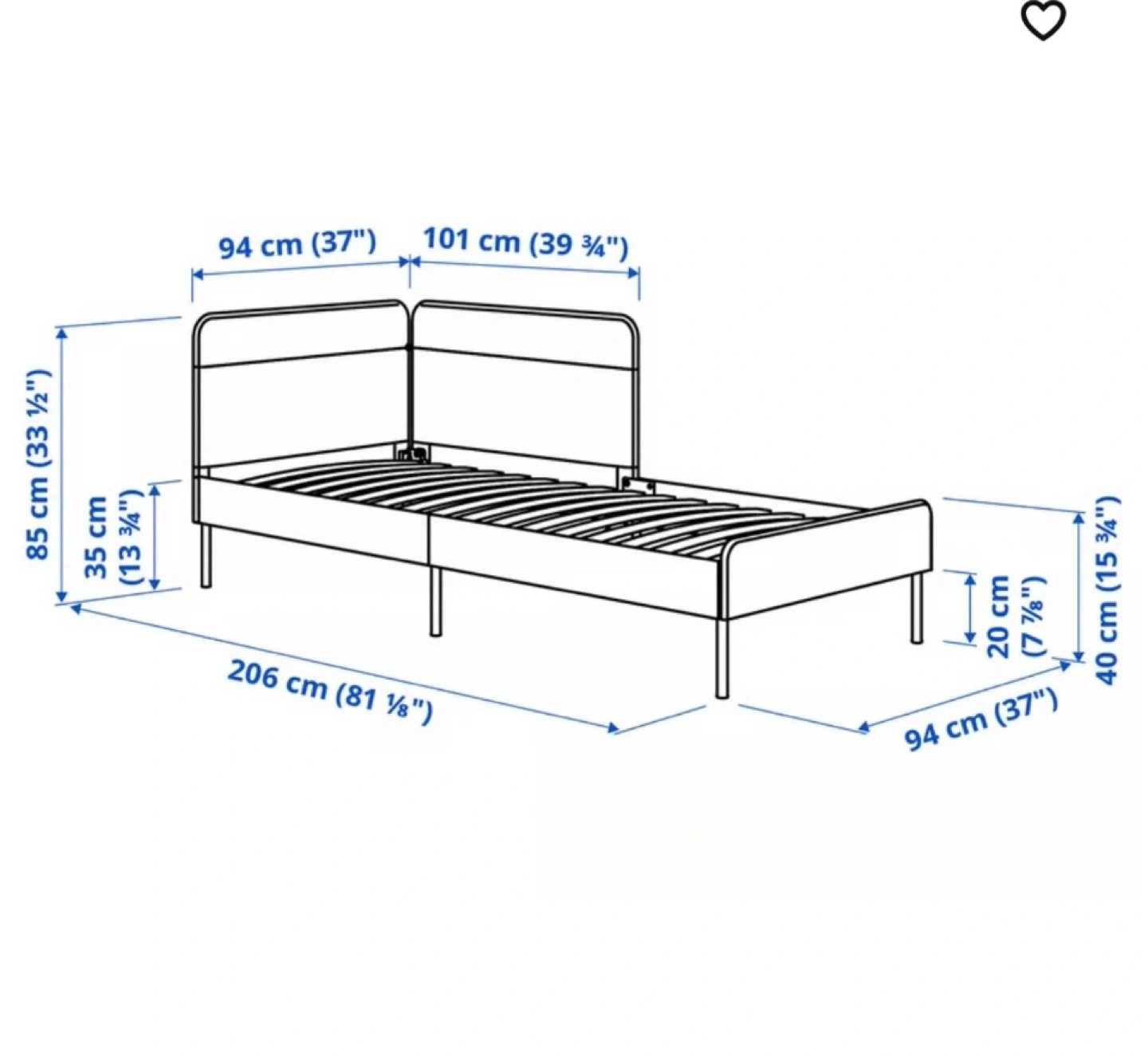 Comfortable day bed, blue fabric upholstery. Sleek black legs. Includes storage space underneath. Perfect for small spaces or guests. Bedframe only.