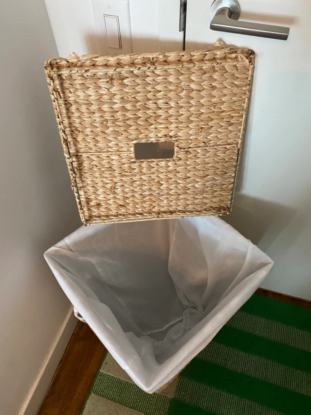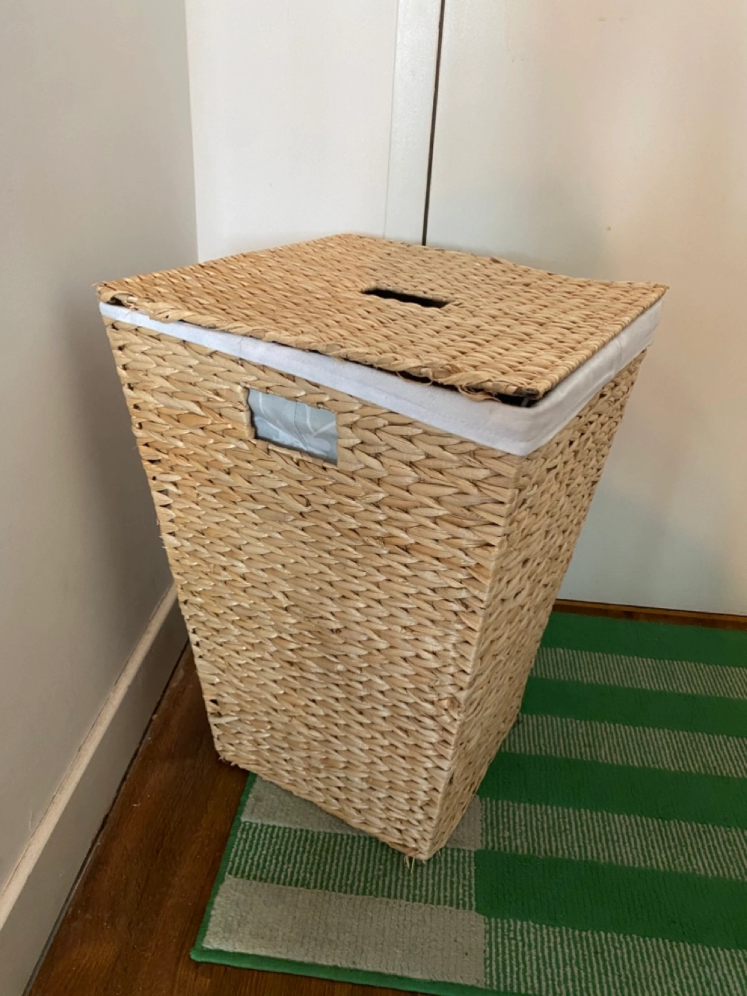 Large seagrass laundry basket. Features a removable lid and a fabric liner. Perfect for storing laundry or other items.