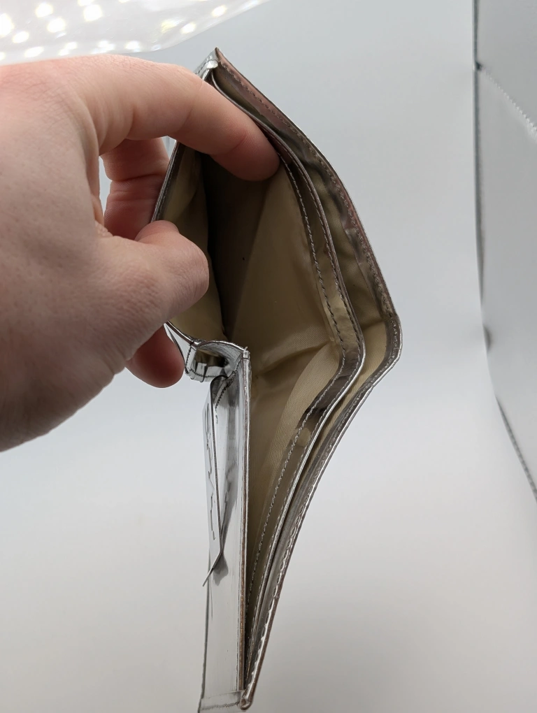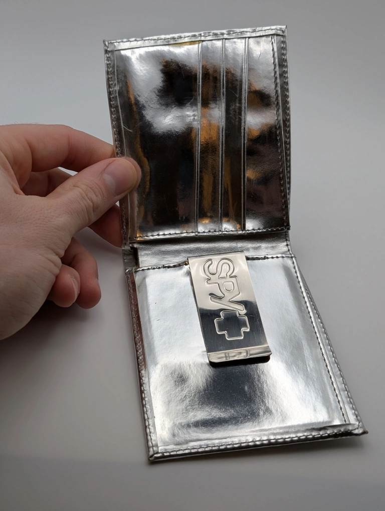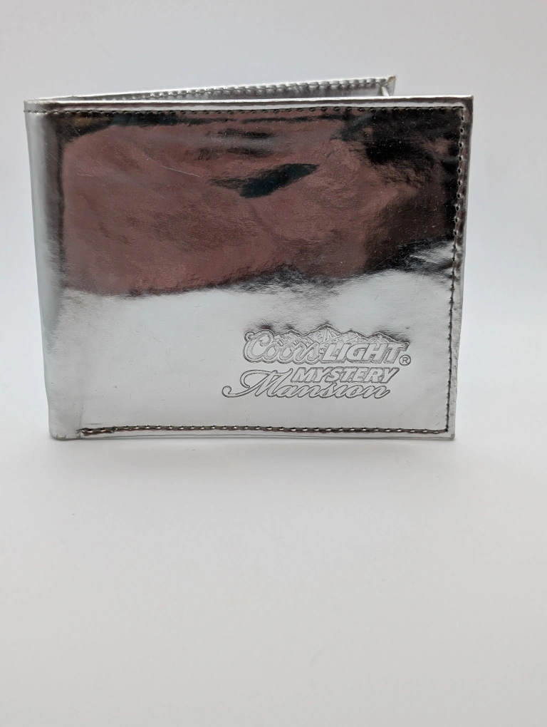 Silver metallic wallet. Features a Coors Light Mystery Mansion logo and a Spy money clip. Multiple card slots.