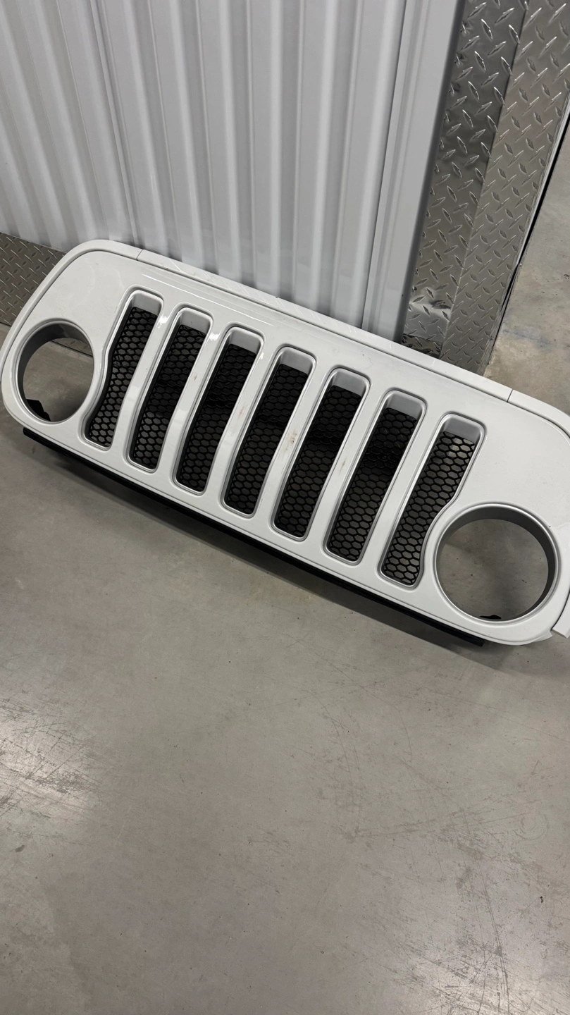 Jeep Wrangler JL front grille. Bright white colour. Used, some minor imperfections. Seven-slot design. Includes all mounting hardware. Fits 2018-2022 models. Excellent replacement part.