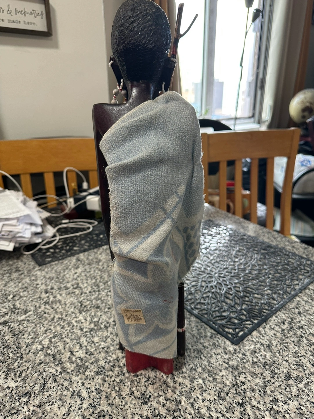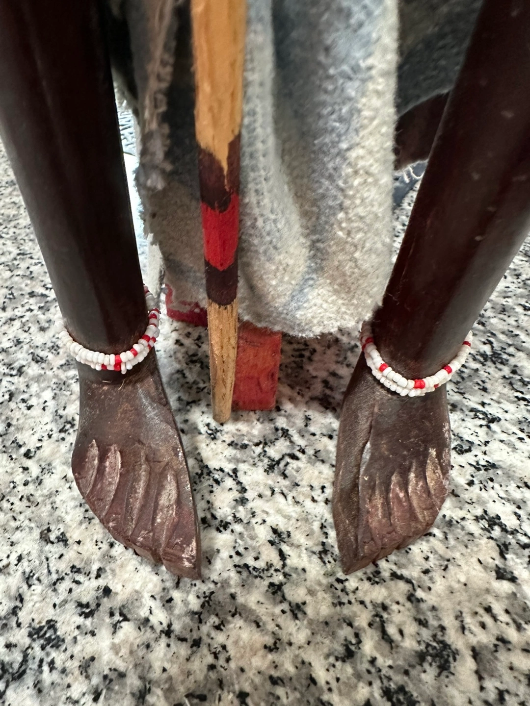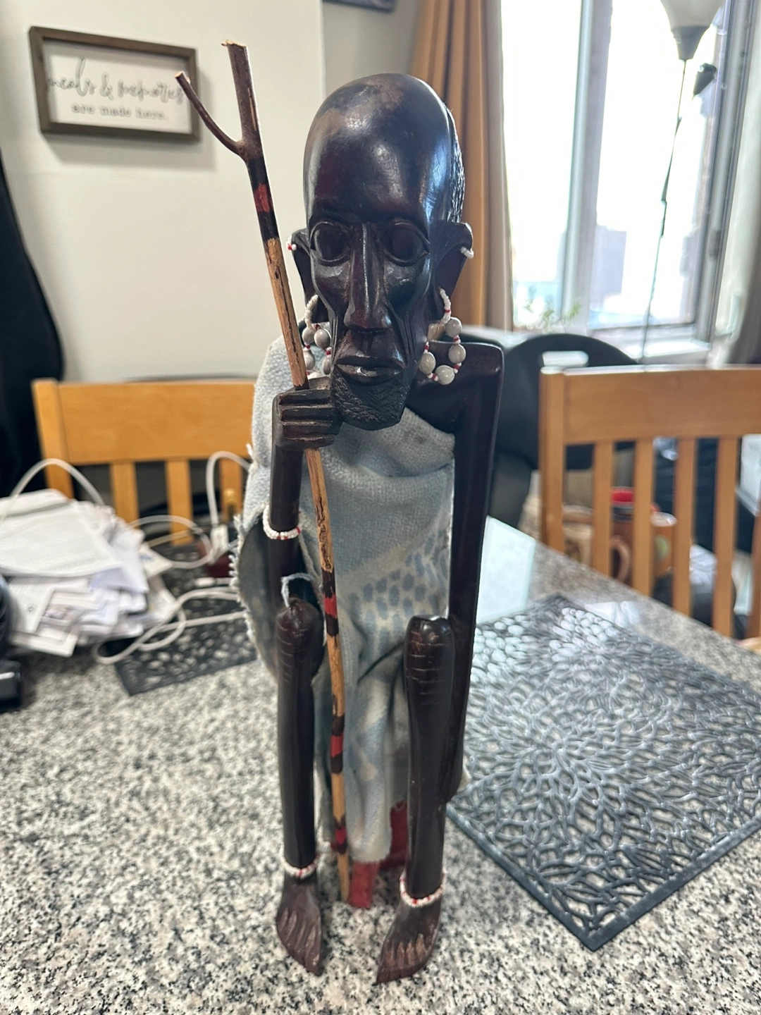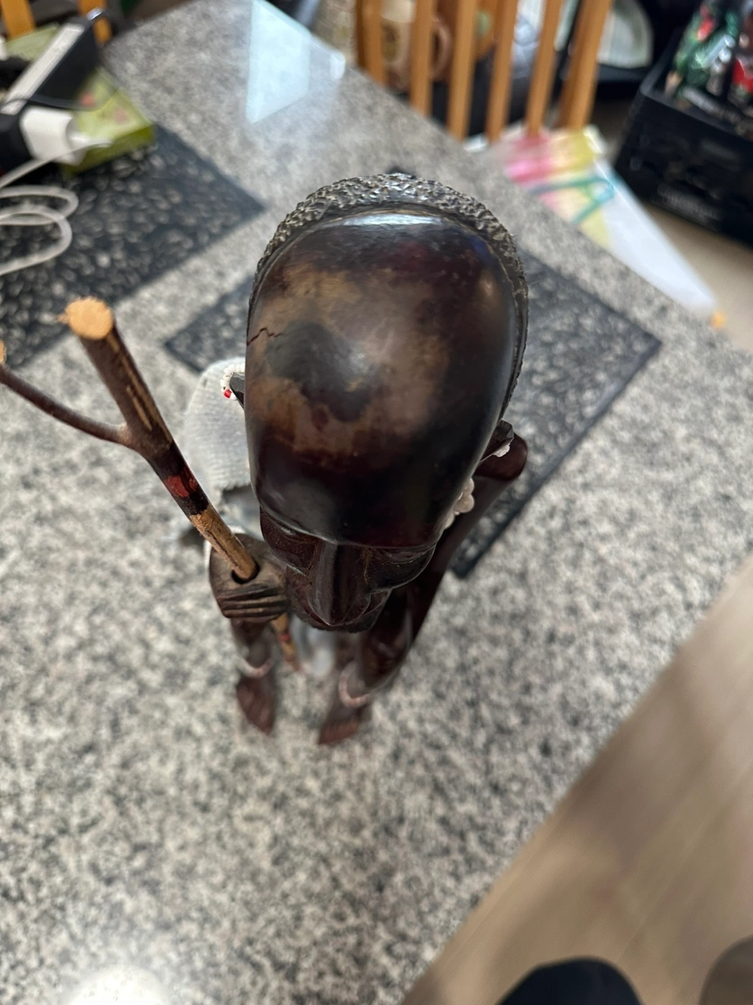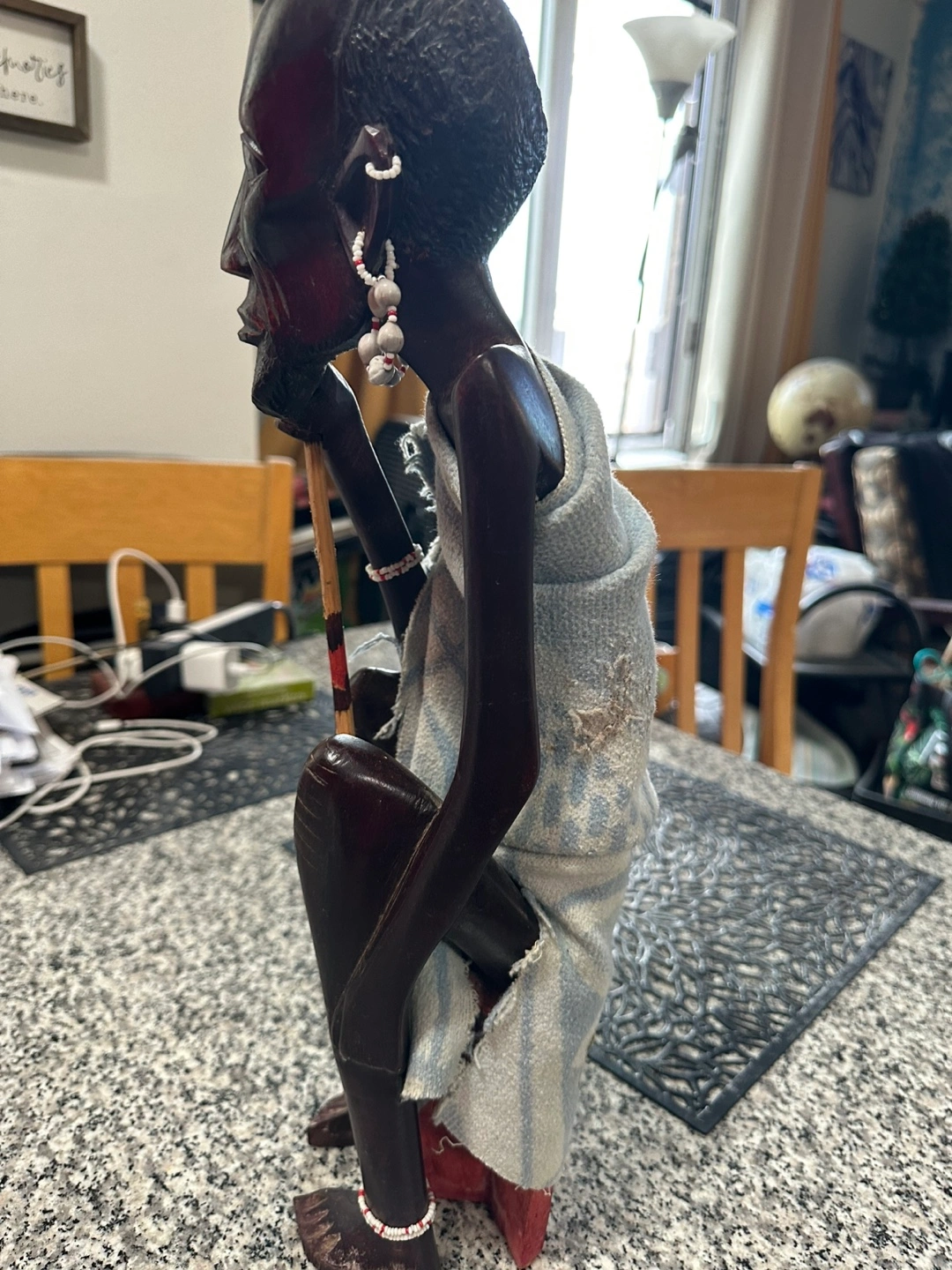 Unique hand carved wooden 18’’ African man the thinker in traditional clothing n beeds Features intricate details. He’s sitting on a carved stool… item from Africa awesome piece pick up or meet at safe zone 42pct