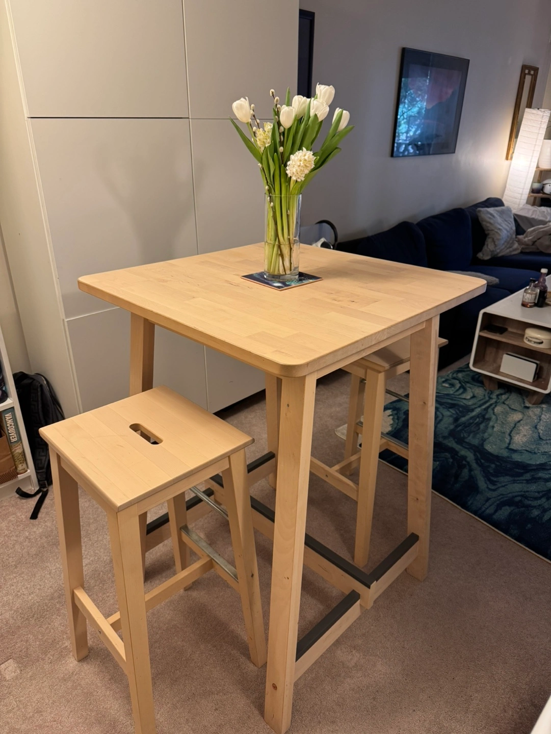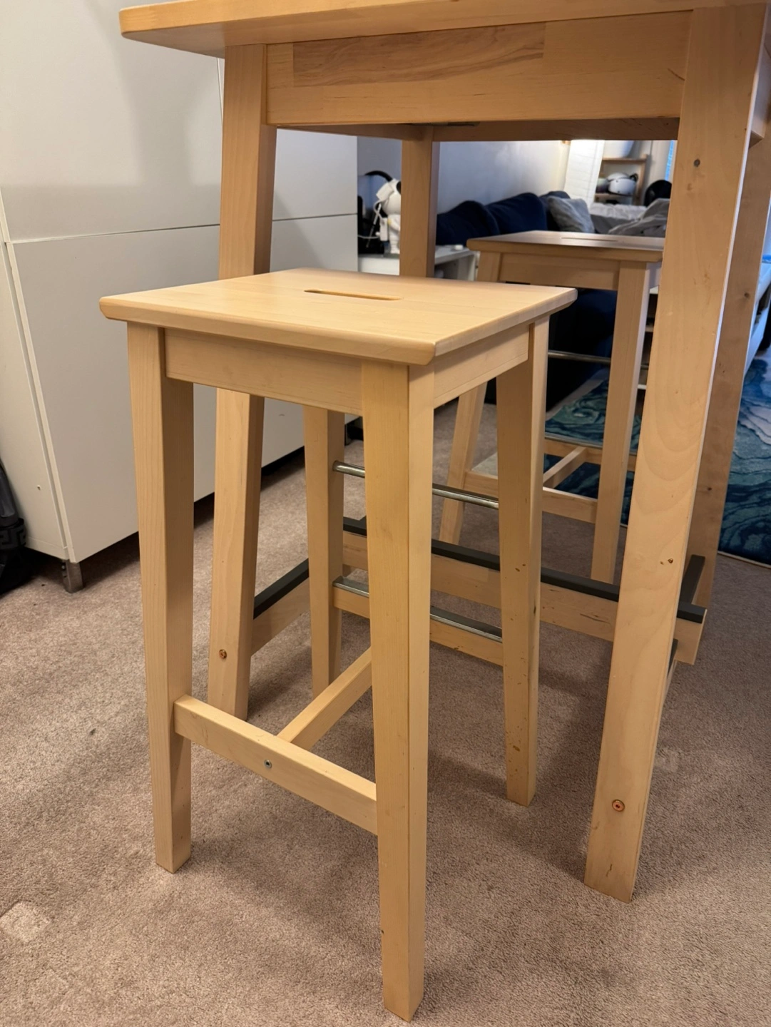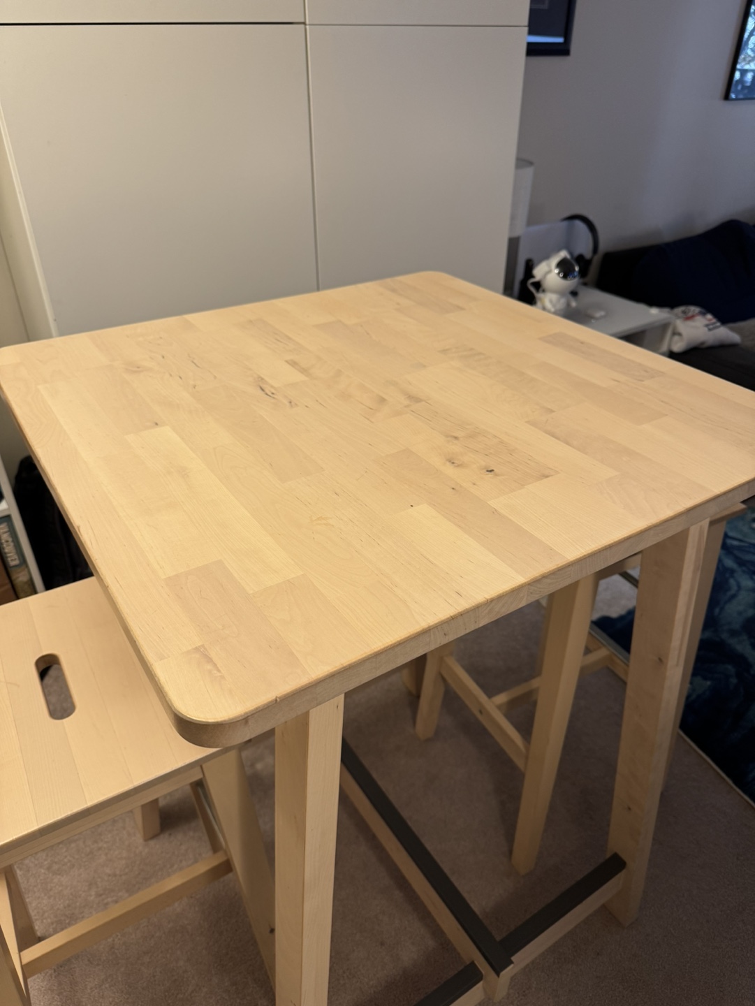 Light coloured wooden table and two matching stools. Square table top. Simple design. Good for small spaces.