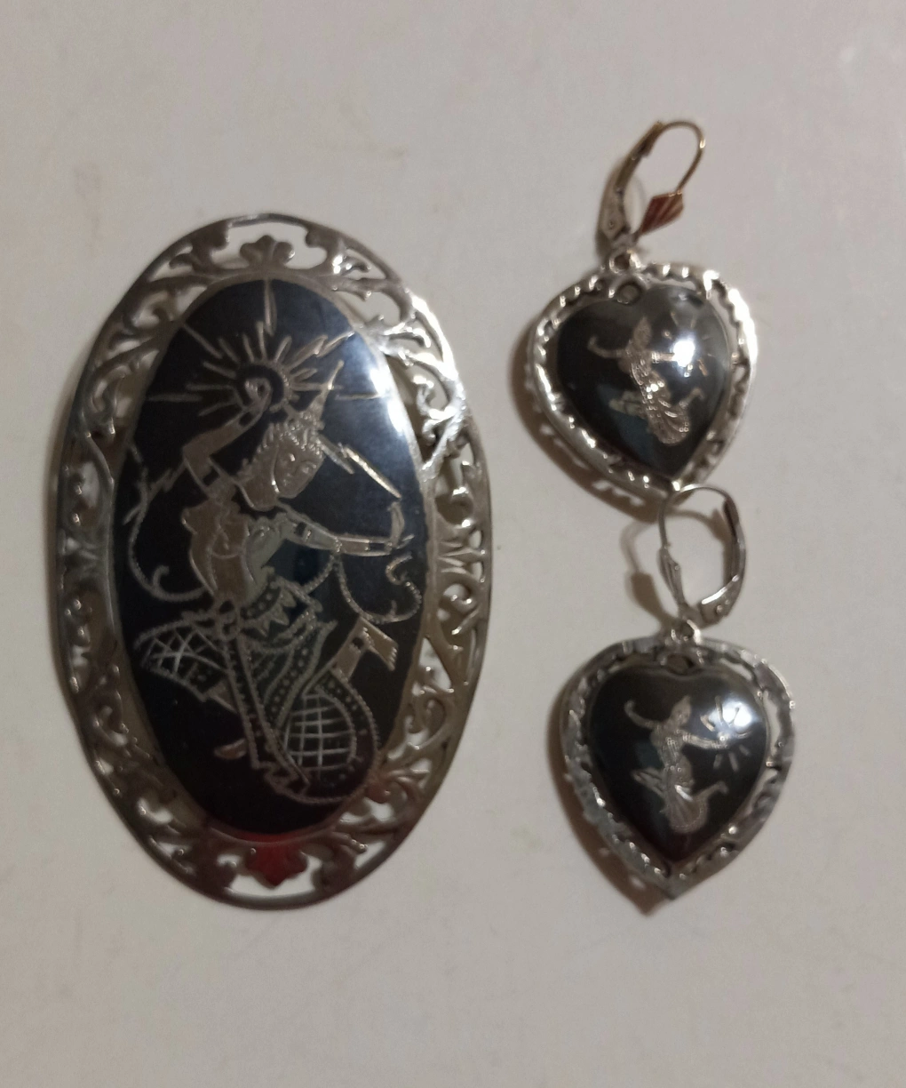 29REDUCED 1930-1940s Sterling silver Niello Alpha Siam brooch and earrings. Mythological Goddess Mekhala (goddess of lightening). brooch 2.5 by 1 5/8 inches Rare Heart shaped earrings, 1 by 1 7/8 inches, earrings have been altered with 4 karat gold hoops for pierced ears, (were originally clip on). Background is blue, photo makes it look gray). Excellent condition all clasps in working order.