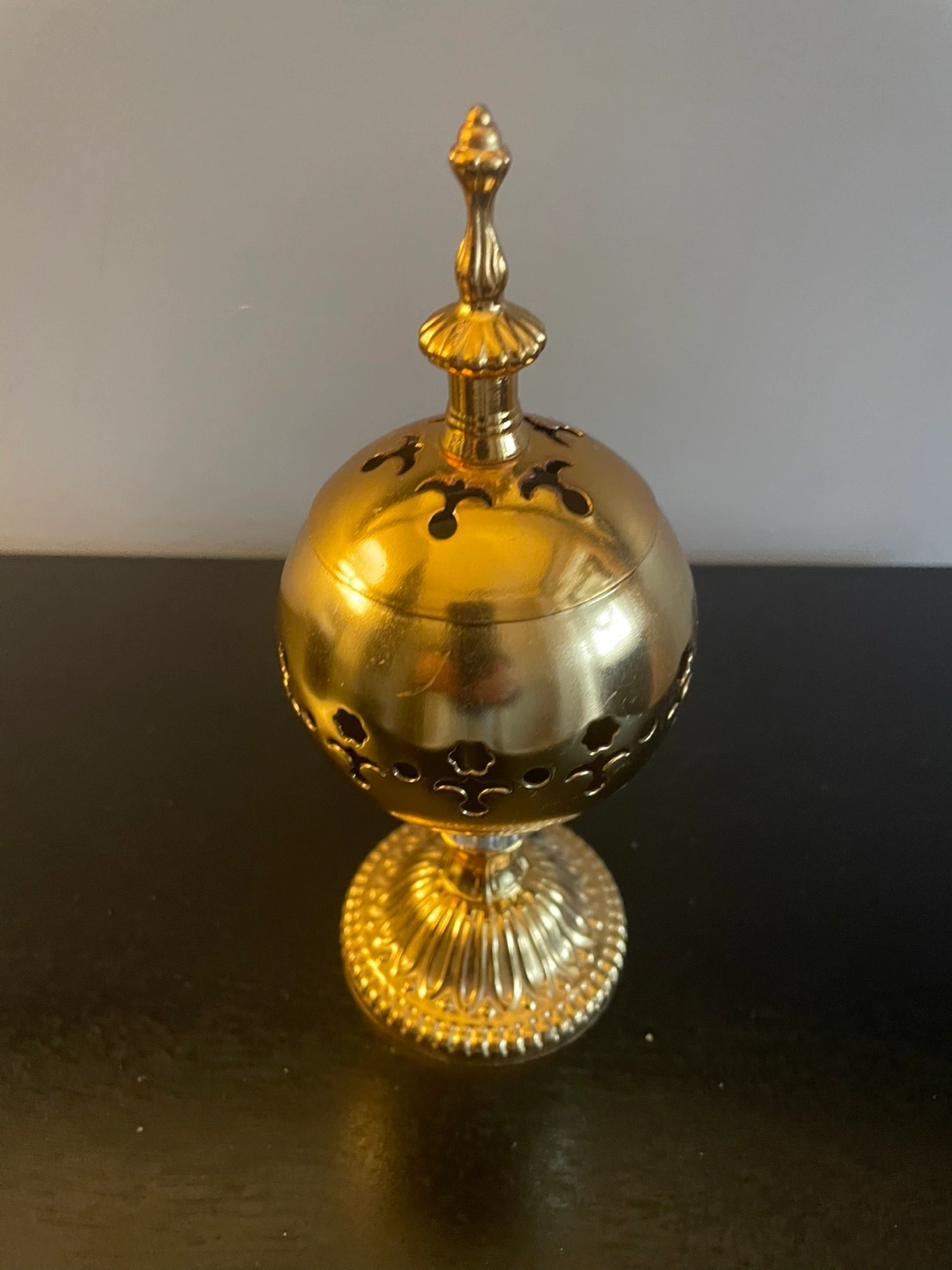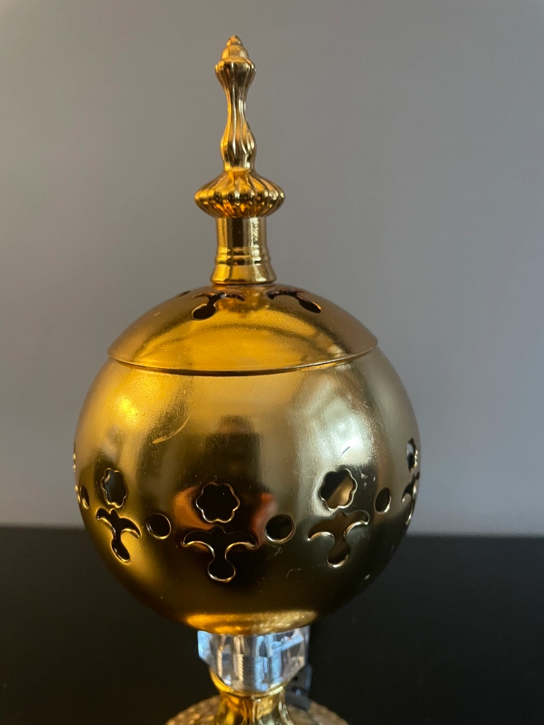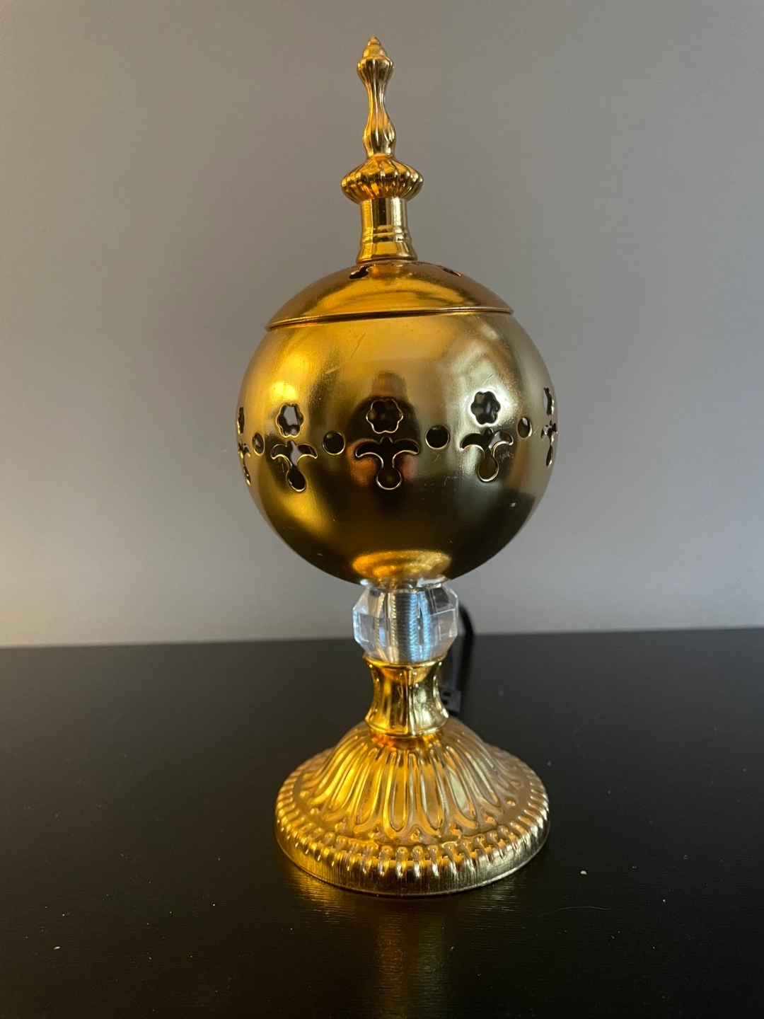Ornate gold-coloured metal incense burner. Features a spherical bowl with decorative cutouts, a detailed finial, and a pedestal base. Electric.