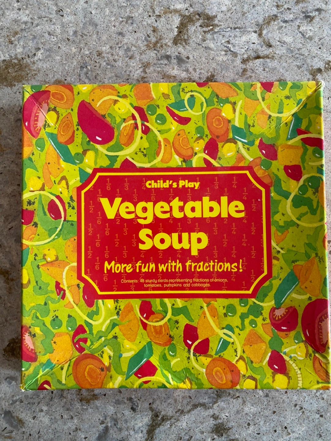 Dive into fractions with this Child's Play Vegetable Soup game, an engaging way to learn math concepts while having fun with food-themed puzzles. This pre-owned game includes 48 sturdy cards representing fractions of onions, tomatoes, pumpkins, and cabbages. No missing pieces, for ages 4 and up.
